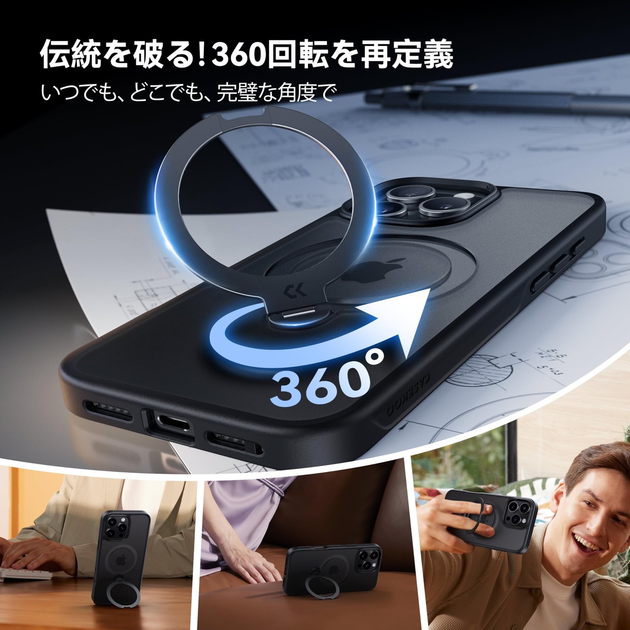 【2025最高傑作&定点360度回転】CASEKOO iPhone 16 Pro 用 ケース 米軍MIL規格 耐衝撃 MagSafe対応 高耐久性【横縦両立・角度自由調整】最大25W急速充電対応 指紋防止/マット仕上げ/黄変防止/半透明 ラップホール付き ワイヤレス充電対応 いphone16pro 用ケース 6.3インチ「MagicStand Pro」(ブラック)