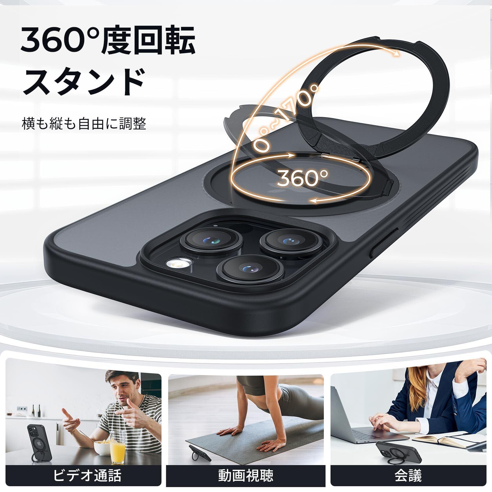 NIMASO iPhone 15 Pro 用 ケース 縦横両対応 360°回転スタンドケース いphone15Pro用 MagSafe対応 携帯スマホケース リングマグネット搭載 カバー ワイヤレス充電対応 マット感 防指紋 米軍MIL規格 耐衝撃性 アイフォン15プロ 用ケース アジャスタブルスタンド ブラック NSC24F1334