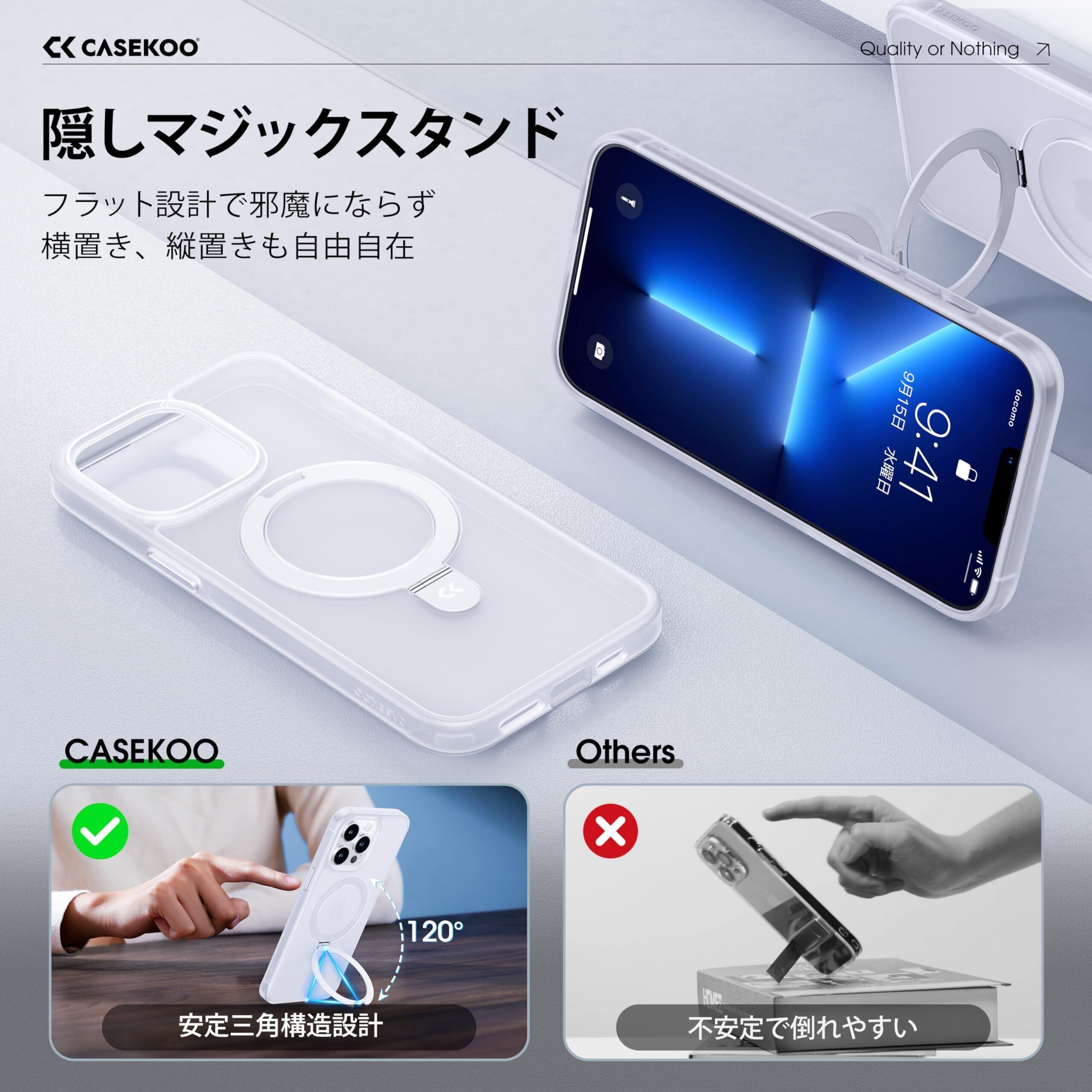 【2025必見!4in1多機能満載】CASEKOO iPhone13ProMax 用 ケース 隠しスタンド 横縦両立 米軍MIL規格 耐衝撃 MagSafe対応 スマホケース 薄形半透明 マット仕上げ 指紋防止 ストラップホール付き ワイヤレス充電対応 アイフォン 13pro max 用 ケース 6.7インチ カバー(マットクリア)