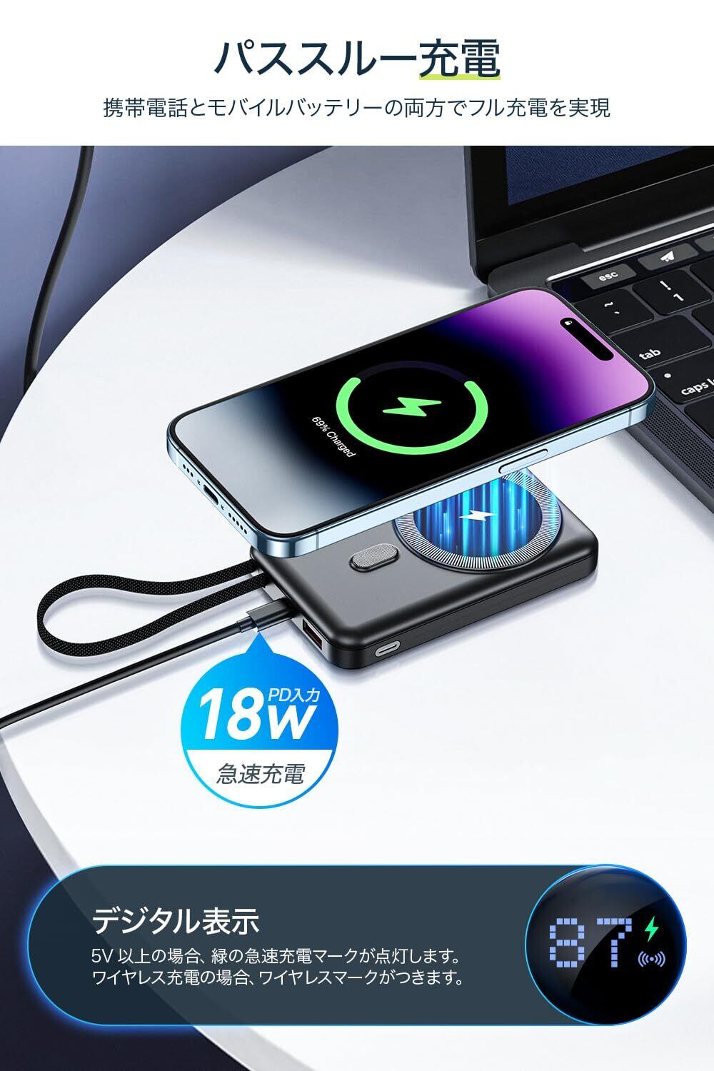 【16000mAh大容量・PD20W/22.5W急速充電】マッグネット式ワイヤレスモバイルバッテリーは16000mAh大容量を備え、iPhone16/15/14/13/12シリーズへ複数回充電が可能です。ワイヤレス急速充電だけでなく、内蔵USB-CケーブルとUSB-A出力ポートを使って充電も可能です。PD/QC3.0対応し、圧倒的な充電スピードを持ち、PD対応機種でしたらわずか30分で0%から60%に充電可能な急速充電器です。