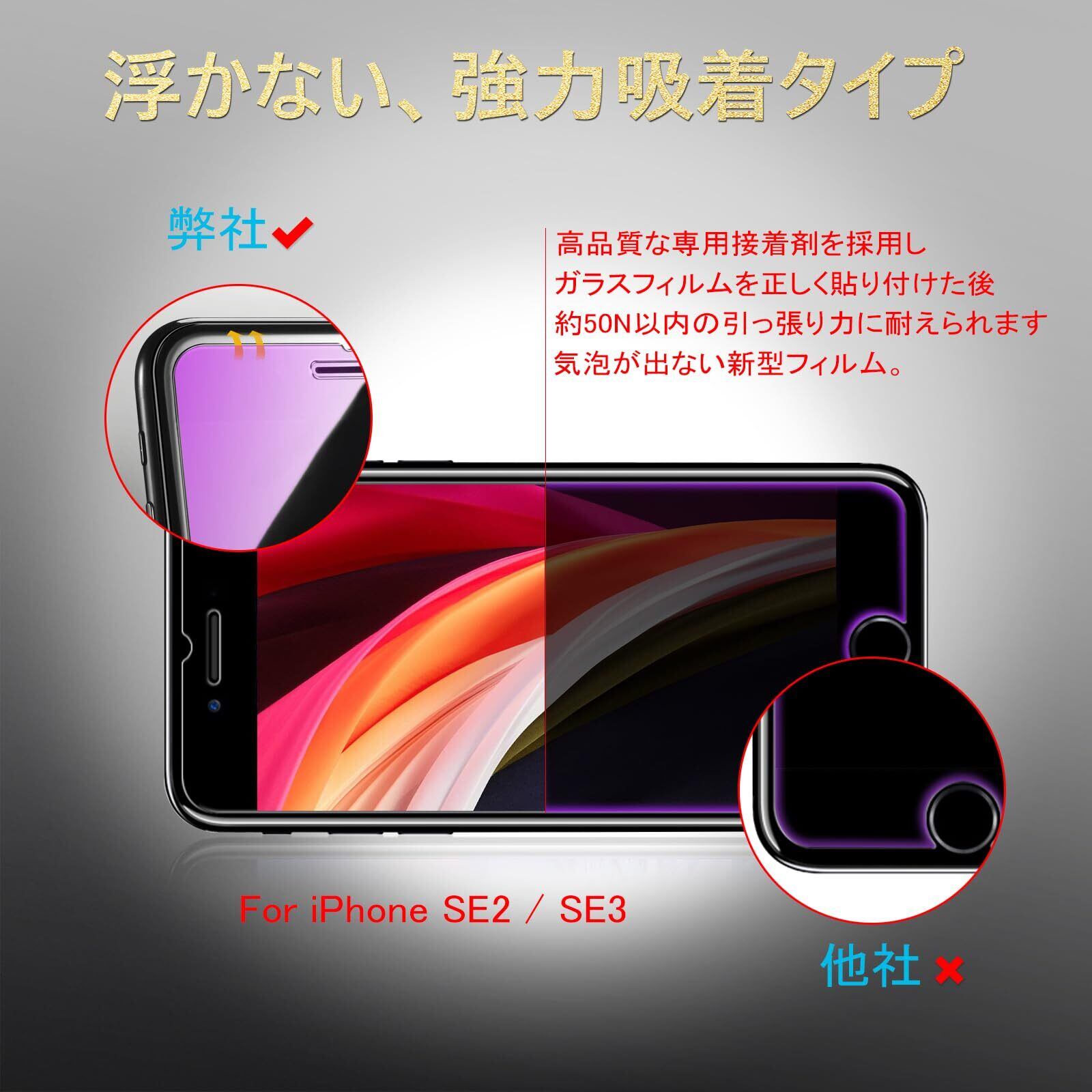 【浮かない、強力吸着タイプ、高感度タッチ】MINIKAのiPhoneSE2保護フィルム,高品質な専用接着剤を採用し、ガラスフィルムを正しく貼り付けた後、約30N以内の引っ張り力に耐えられます。そのため、しばらく使用した後に脱落したり、感度が低下したりする心配も必要ありません。