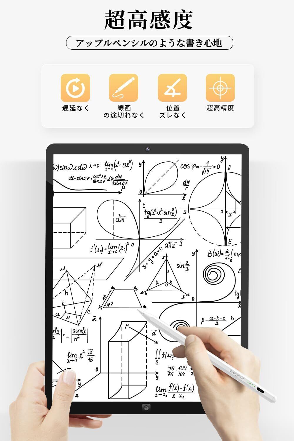 【パームリジェクション&傾き感知機能】Detoypapaのあいぱっと タッチペンは、パームリジェクションと傾き感知機能を備えており、より快適で自然な書き込みや描画体験を提供します。パームリジェクション機能により、画面に手のひらを置いても誤タッチが発生しません。傾き感知機能により、スタイラスを異なる角度で使用することで、線の太さやシェーディングのバリエーションを正確に制御できます。01