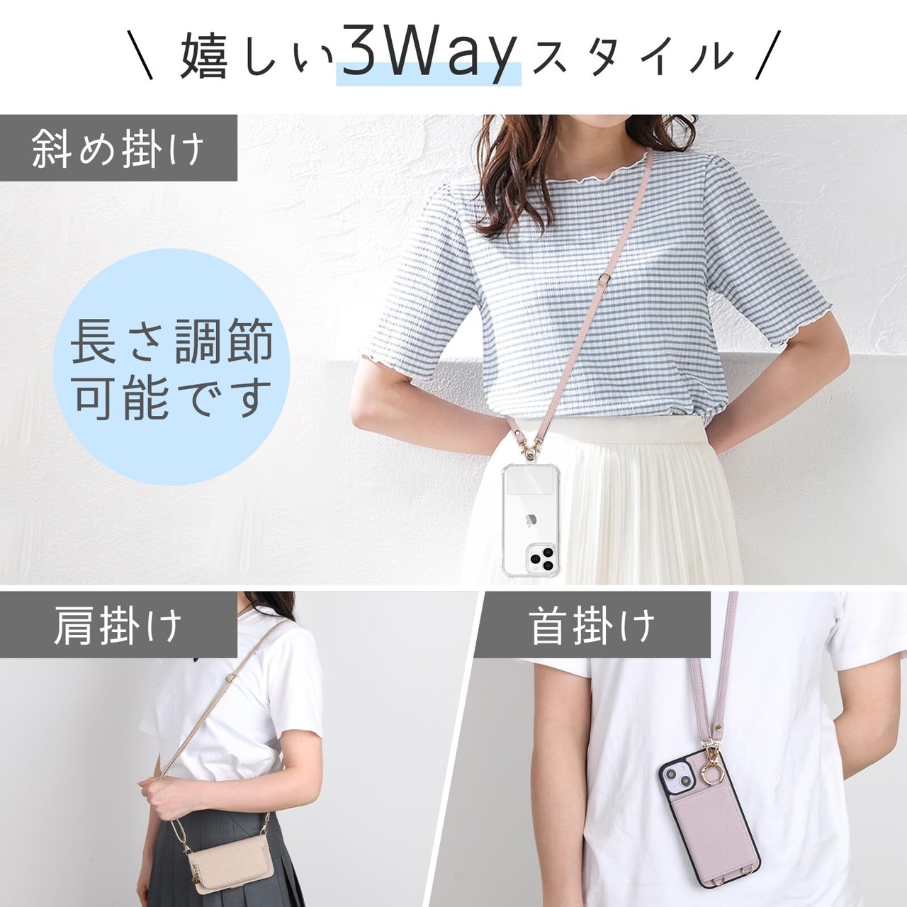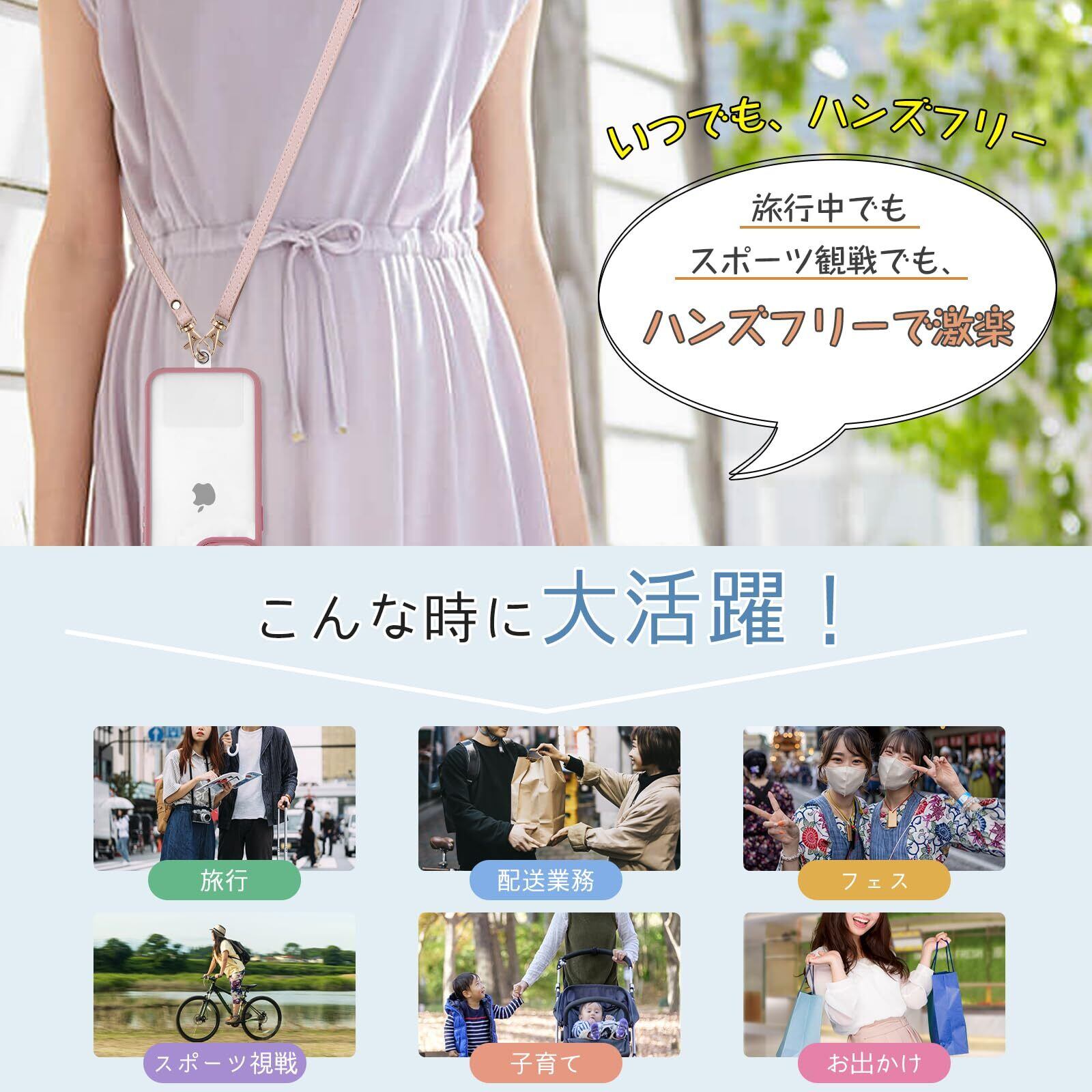 【装着・取り外し簡単&長さ調節可能】男女ともに使えるデザインで、ショルダーストラップ、ネックストラップ、スラントストラップなど、様々な使い方ができる携帯ストラップです。透明カードをケースに差し込めば、好みに合わせてストラップの長さを自由に調整でき、両手が自由に使えます。また、簡単に取り外すことも可能です。