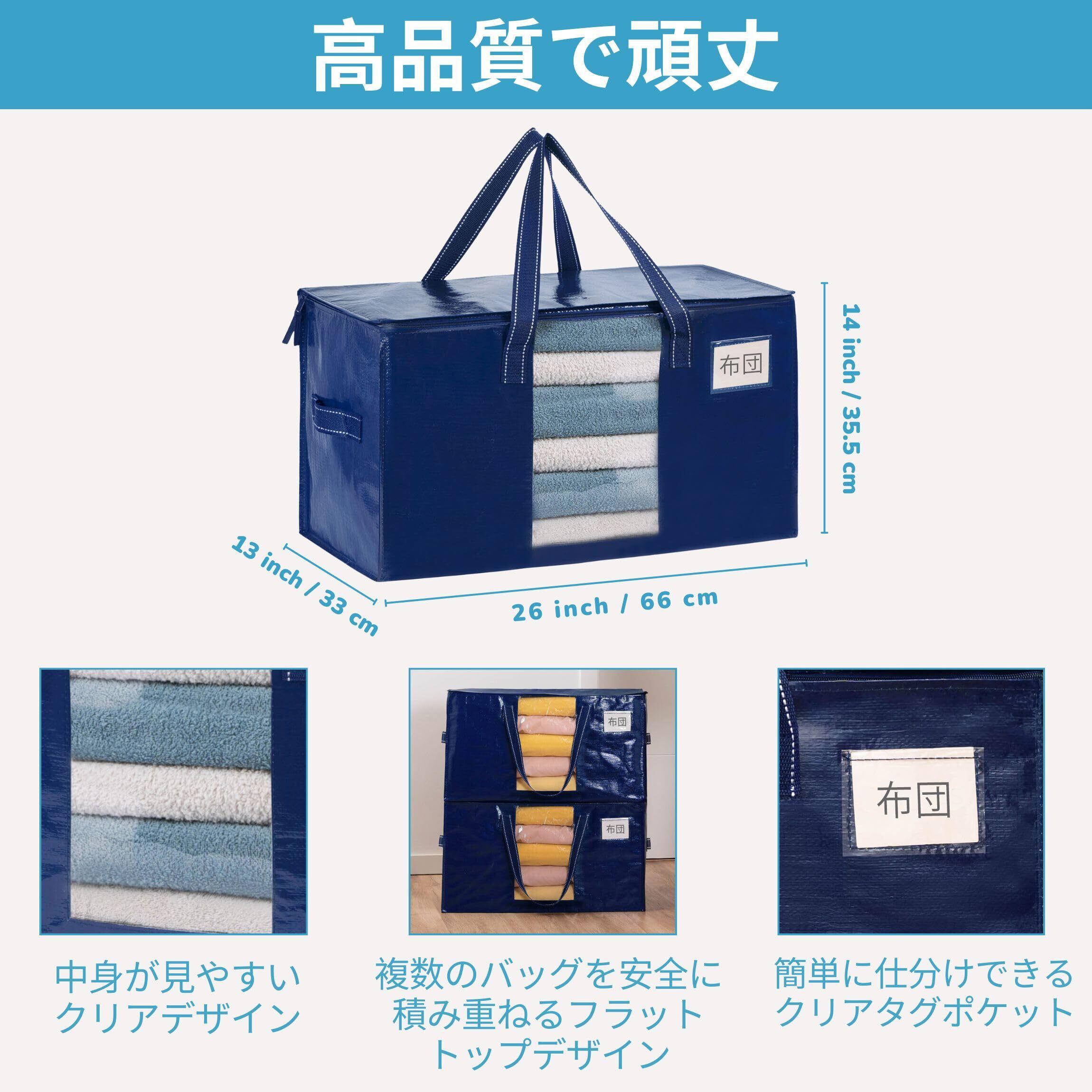VENO 布団収納袋 引越しバッグ 76リットル大容量 収納ボックス ダンボール 収納ケース の代替品 窓付き 耐久 耐水 折りたたみ可能 洋服収納 引っ越し キャンプに最適 ジッパー付き (ブルー 2個セット)