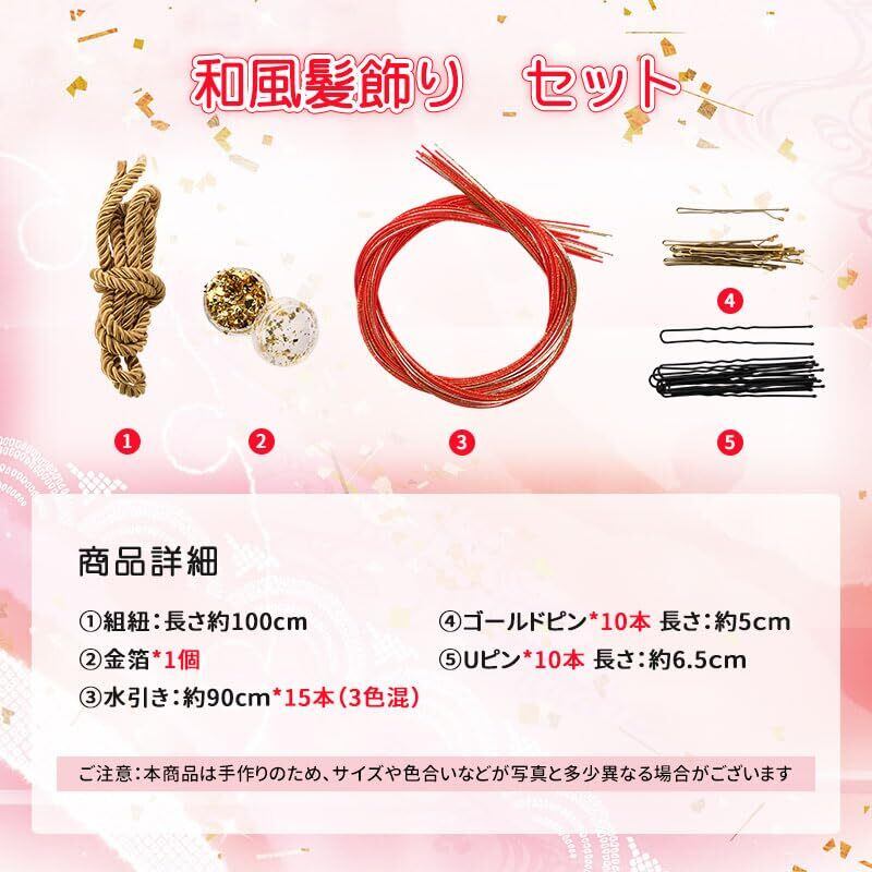 和装髪飾りヘアアクセサリーセット内容:金箔:1点 水引:約90cm*15本 Uピン:10本 ピン:10本 組紐:長さ約100cm 単体でも、他の髪飾りと組み合わせて使用するのもOKです。