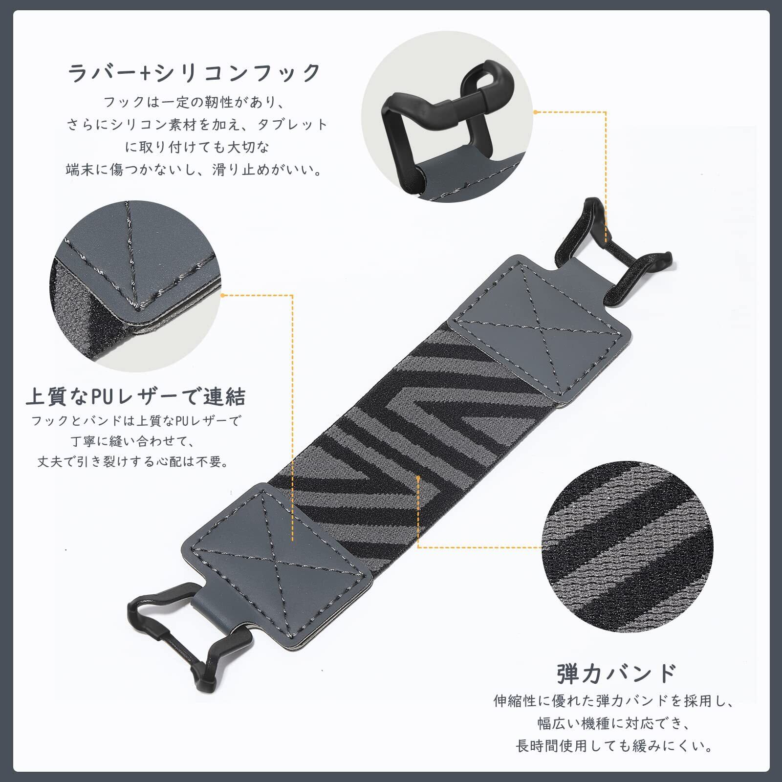 「伸縮性のいいバンド」 優れた伸縮性がある弾力バンドを採用し、幅広い機種に対応でき、長時間使用しても緩みにくいです。上質なPUレザーを使用してフックの部分と丁寧に縫い合わせて、丈夫で引き裂けする心配は不要です。フックの部分は一定の靭性があるラバー素材を採用し、タブレットに取り付けても大切な端末に傷つきません。