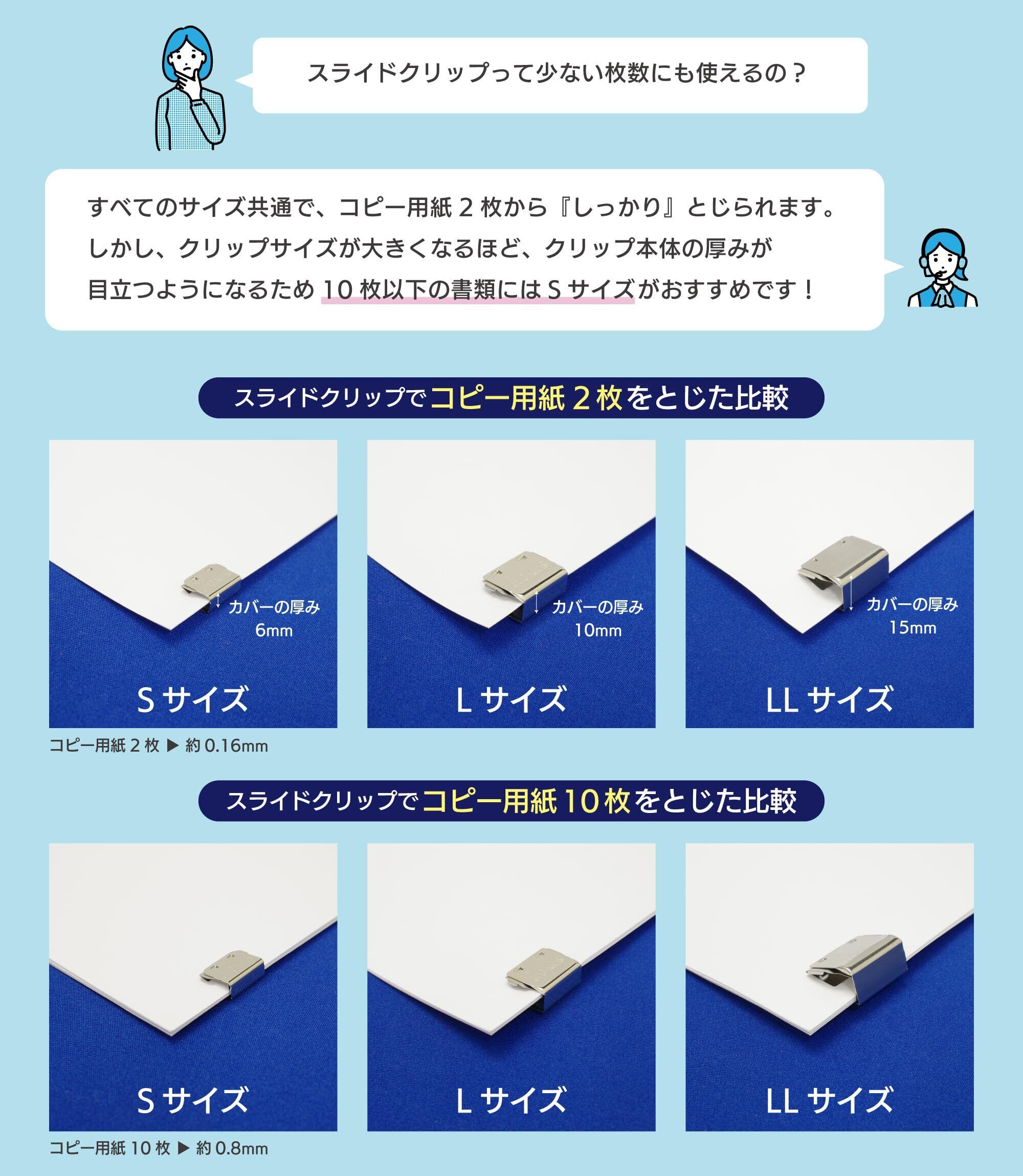 6. LLタイプ‥コピー紙90枚まで綴じられます。(クリップのサイズ 縦35×横26×厚さ15mm 一個の重さ:4g)
