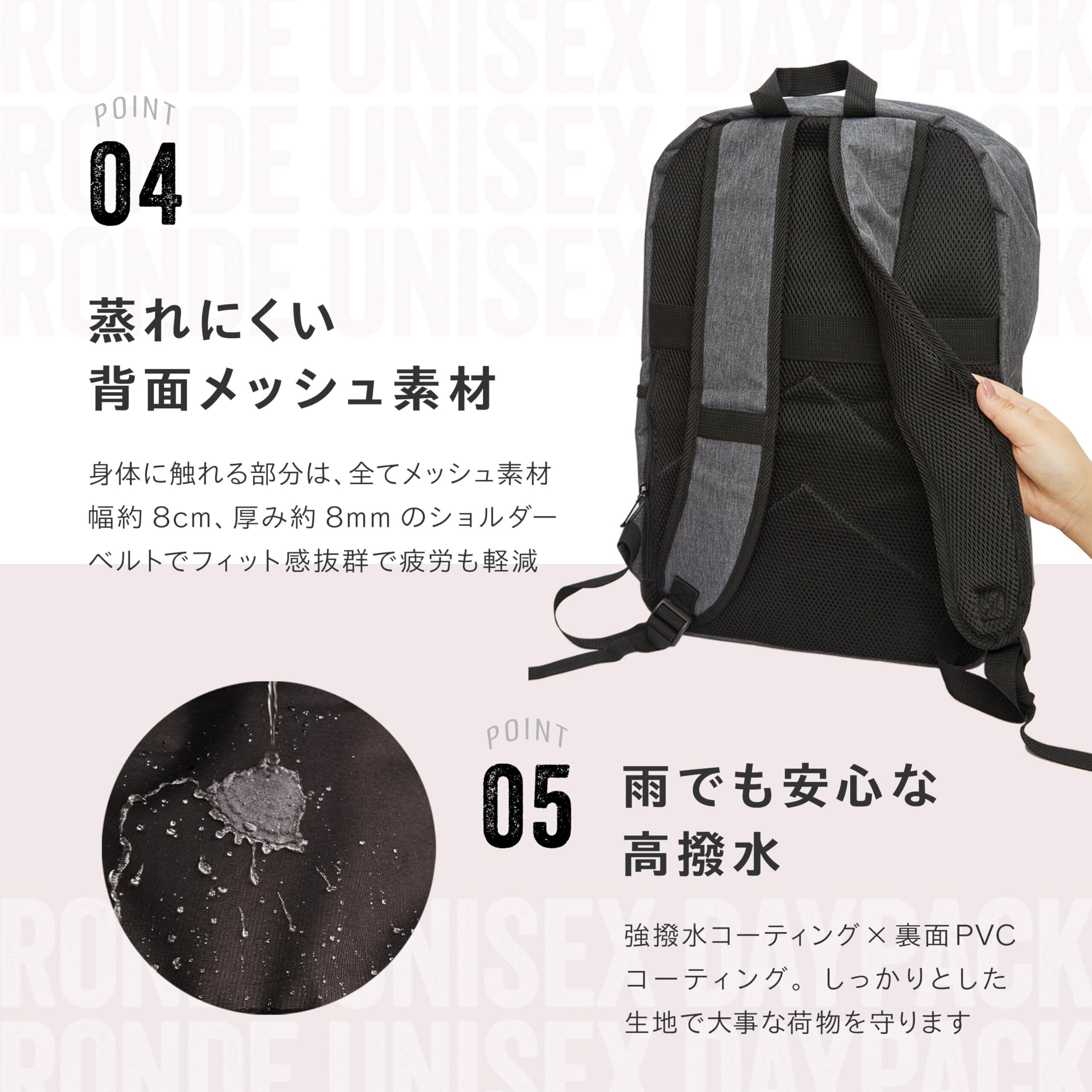 【RONDE DAY PACK】定番×高機能素材×多収納仕様×軽量でベーシックアイテムが飛躍的に進化しました。ビジネスや普段使いはもちろん、アウトドアやマザーズバッグとしても活躍できる機能性を備えており、どんなコーディネートにも合うシンプルなデザインも特徴的です。バックパックの定番モデルに強撥水コーティングと裏面加工を施した高機能素材と高い収納性をプラス、更には軽量性までも実現した万能バックパックです。