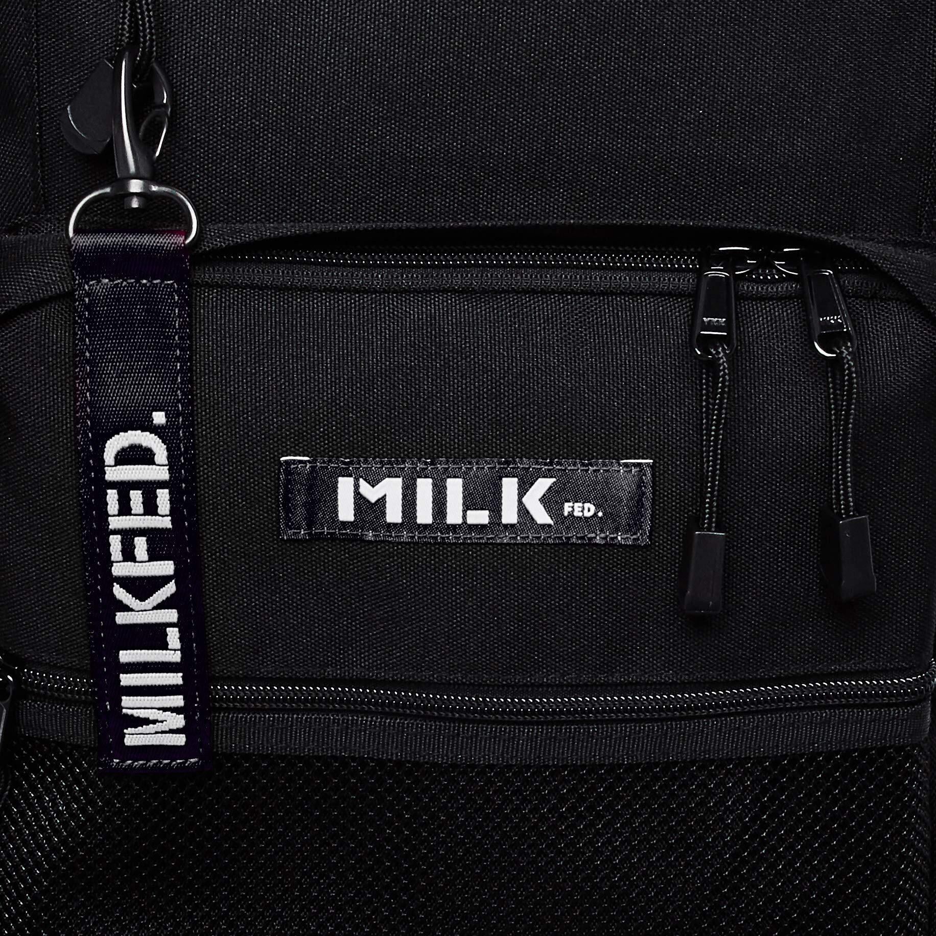 MILKFED.ロゴがデザインされたダブルジップ仕様のバックパック。容量が大きく、収納スペースにも優れた旅行時に最適なアイテム。