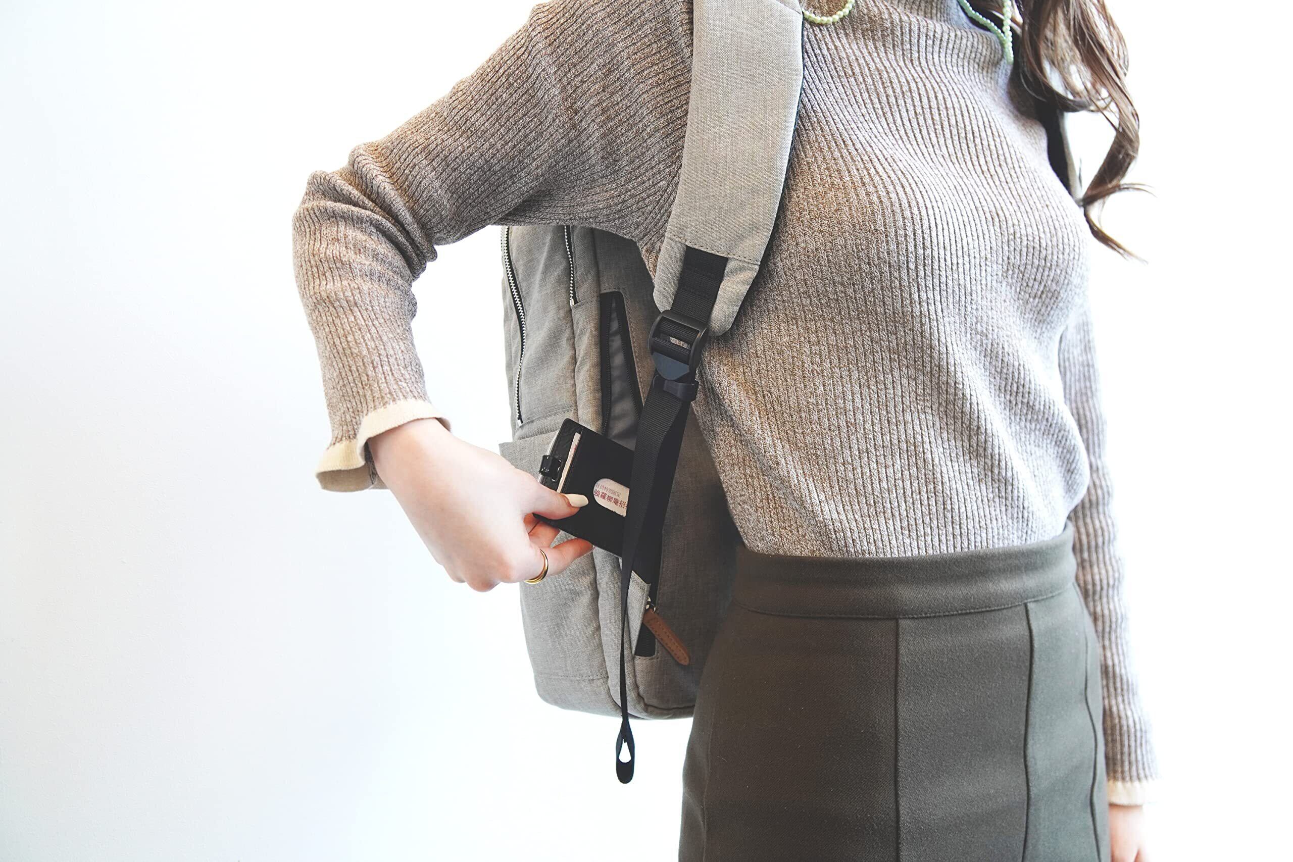●セキュリティ性の高い背面ファスナーポケットは、定期入れや社員証などすぐに取り出したい小物の収納に便利です。