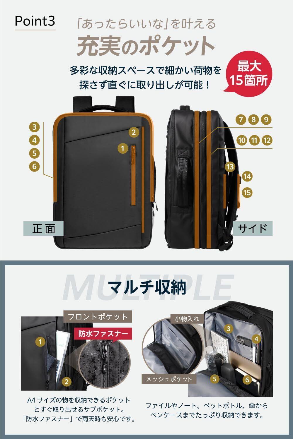 【マルチ収納】使用頻度が高いものを入れるスペース。A4サイズのファイルなどたっぷり収納できます。 【トランク収納】乾湿分類ポケット付きで、2〜4日分の衣類と、濡れたものを分けて収納できるので出張や旅行に重宝できます。 【デバイス収納】パソコンや書類入れるのに最適なスペース。17インチのPCも楽々収納でき、縦横どちらからも取り出しやすい仕様です。 【盗難防止ポケット】背面には、デイリーに使う携帯やお財布等の貴重品が出し入れしやすいポケット付きです。