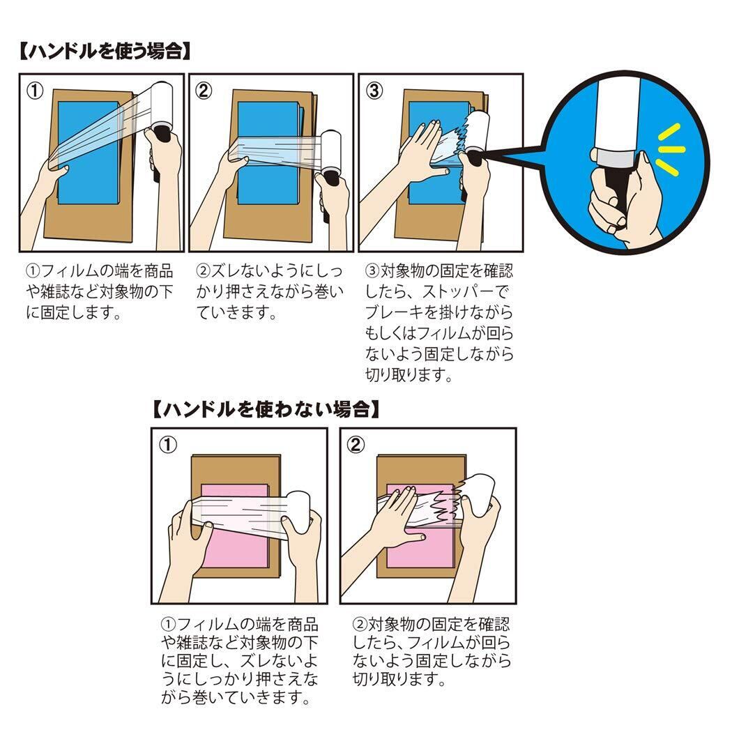 使用シーンは多岐に渡り、雑誌、新聞、段ボールや個人間取引をはじめ、引っ越しの荷造りも手軽に梱包。ガムテープや荷造り紐で行っていた作業を簡単・スピ-ディーに出来ます。やり方は対象物をラップでくるくるっと巻くだけで。静電気によって、ラップ同士がくっつきます。※カットに便利なストッパー付き。