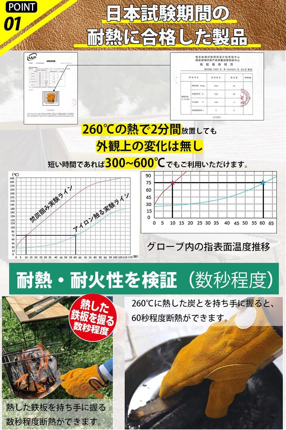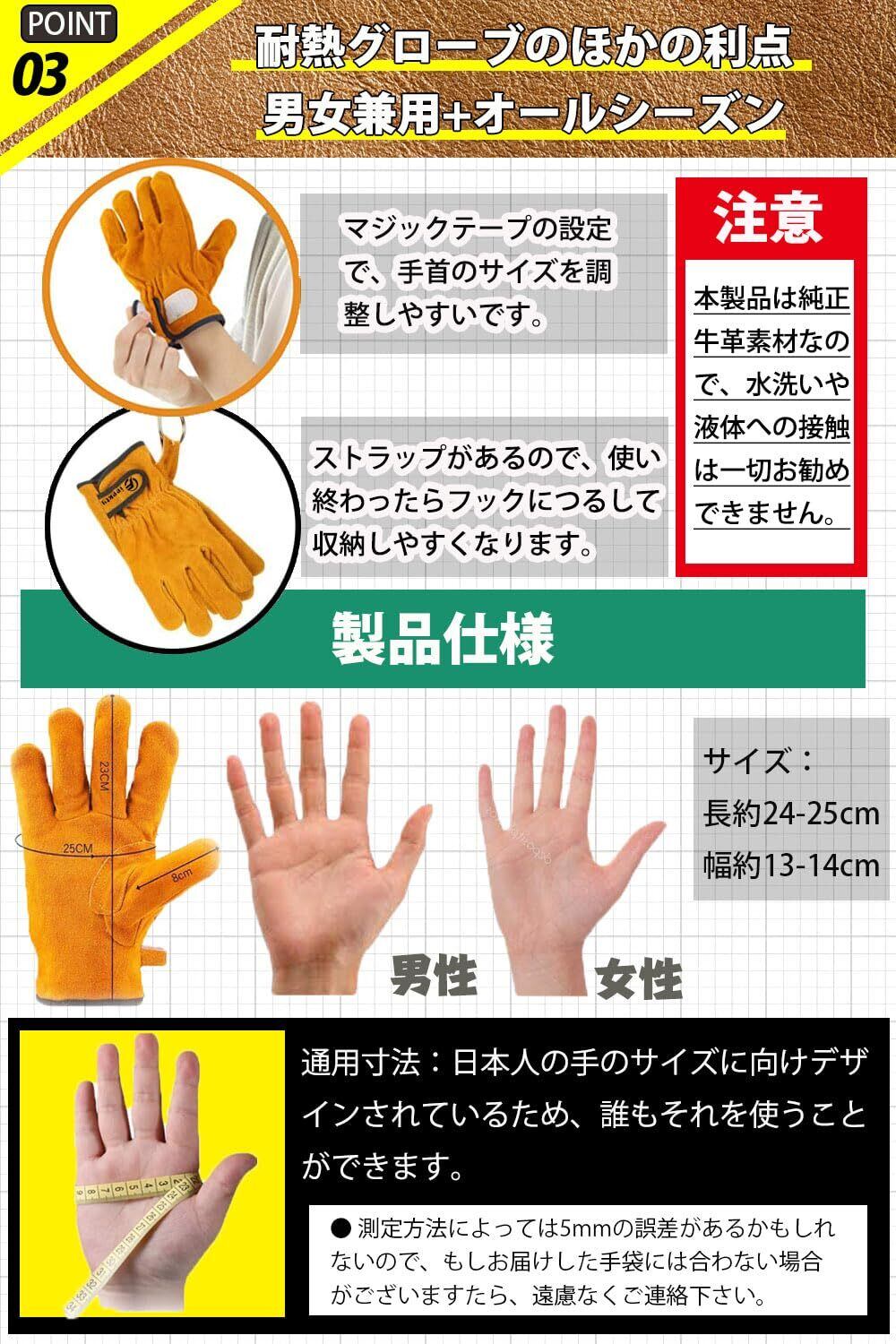 【耐熱グローブの特徴】耐熱手袋は2層があります。①外側100%牛革で耐熱性や耐久性高いです。②中側100%綿で手を守るし、遮熱性も向上します。サイズ:フリー(長約25cm 幅約14cm);適用:男女兼用+オールシーズン。注意:本製品は純正牛革素材なので、水洗いや液体への接触は一切お勧めできません。