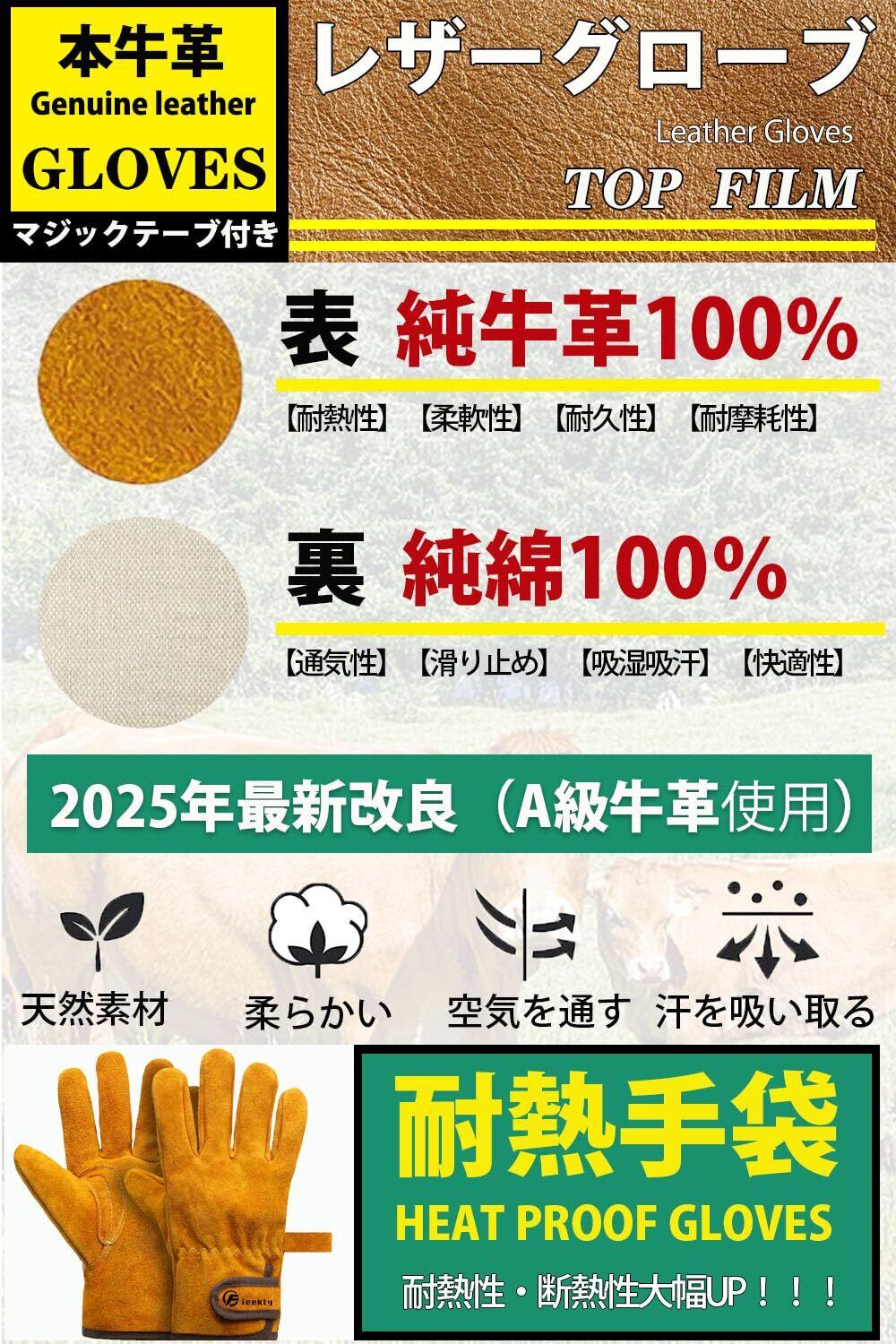 [Fieekty] 耐熱グローブ キャンプ 焚き火 バーベキュー アウトドア用耐熱手袋 【耐熱試験合格】 臭いない 牛革 耐火 薪ストーブ 焚き火台 溶接 園芸用 作業用手袋 裏付き吸汗 高温耐性350℃