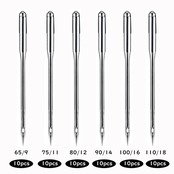 【商品内容】6種類の異なる寸法のミシン針が60本入りのセットです。(9号10本、11号10本、12号10本、14号10本、16号10本、18号10本)。
