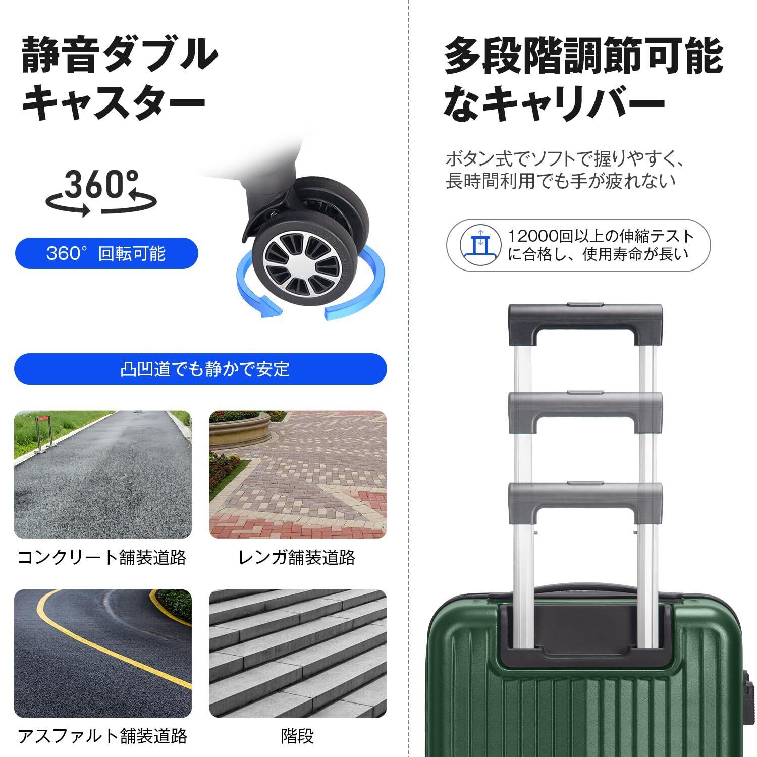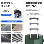 【多機能で実用的なキャリーケース】360°自由に回転可能な静音キャスターは静かで耐摩耗性を大幅に向上し、デコボコ道でもスムーズな滑りを実現します。世界基準のTSAダイヤル式ロック付きでセキュリティも万全。※鍵穴が航空会社の検査専用の物で本製品は鍵が付属しておりません。物掛けフック式底足付きで手荷物を掛けて気楽に移動でき、旅行中の手への負担を軽減します。