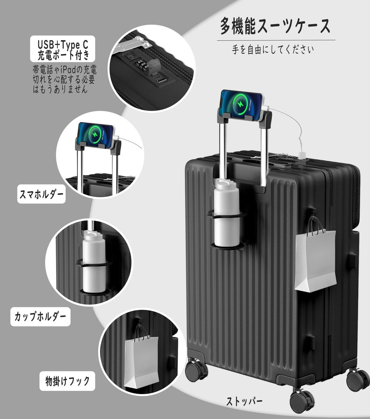 【キャスター ストッパー付き 、USB+Type C充電ポート付き 、 カップホルダーとスマホルダーを付く】 ASHARDフロントオープンシリーズのバージョンアップモデルです。走行中の揺れる電車内でもストッパー(ブレーキ)機能でピタっと自立。乗降時や座席の離着席時などではすぐにストッパー解除ができるのでスムーズに移動を再開することができます。スーツケースにモバイルバッテリーを収納するポケットがついており、 USB+Type Cポートの充電口が外にあることで、いつでもどこでも充電できます。便利な折りたたみ式ドリンクホルダー付き。バックカップホルダー、ミルクティーカップ、傘いつでも配置でき、旅行をより便利にすることができます。レバーの上部にはスマホルダーが付いているので、フライトの待ち時間に両手が自由になり、外出先でもリラックスできます。