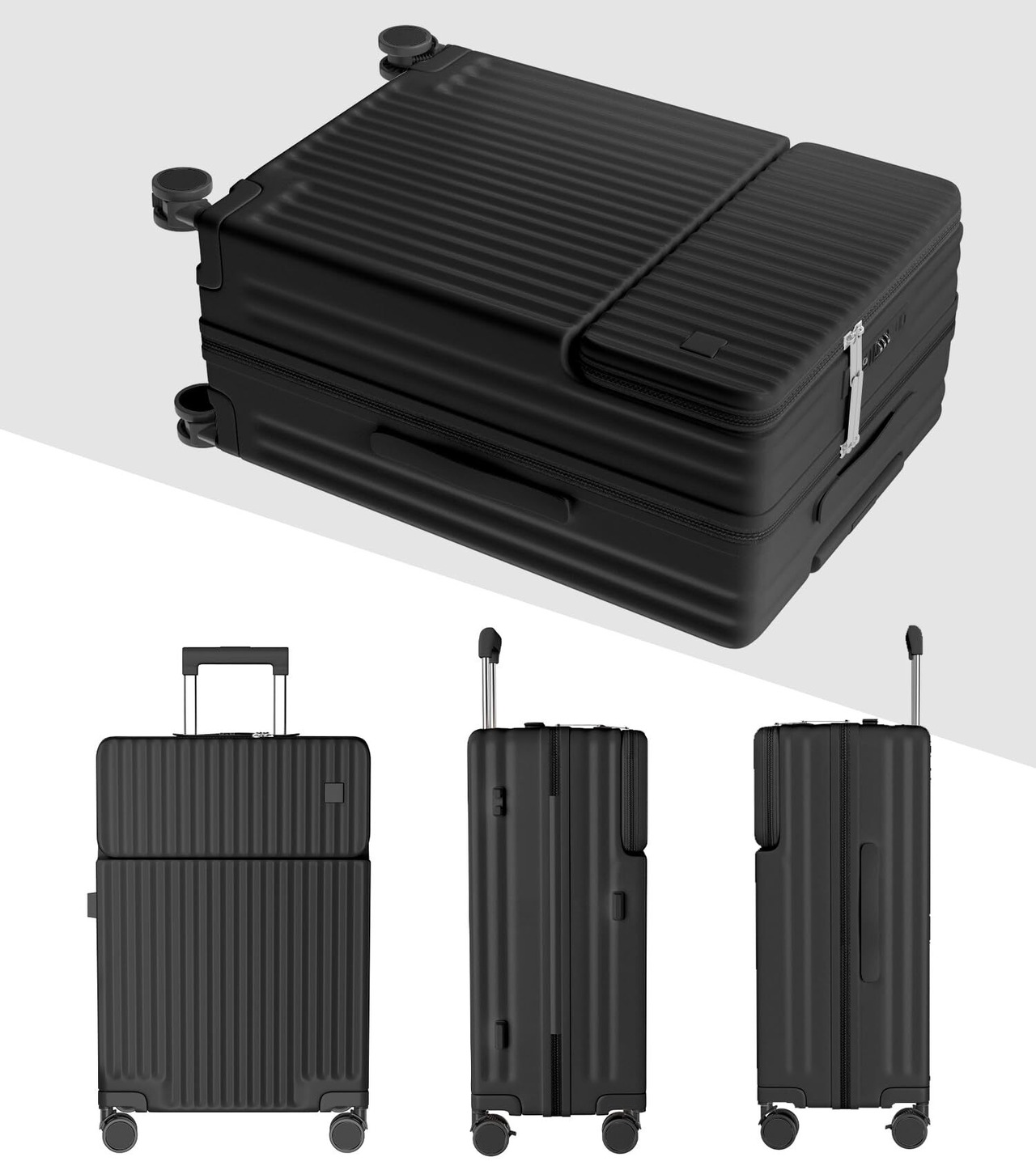 [Ashard] キャリーケース 多機能 スーツケース ストッパー付き Type C と USBポート付き フロントオープン ジッパー キャリーバッグ 電話ホルダー カップホルダー付き 隠しフック機能 超軽量 耐衝撃 静音 360度回転キャスター 100%PC材質 人気 頑丈 可愛い TSAロック搭載 旅行 ビジネス 出張 修学 (Sサイズ/1-3泊/42L/機内持込, ブラック)