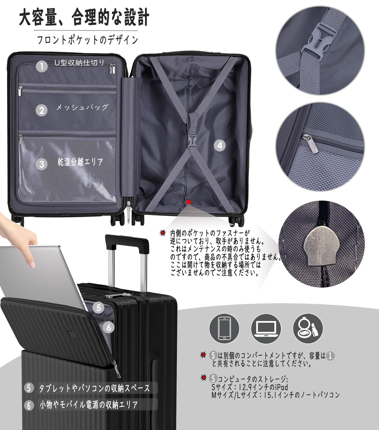 【多機能フロントカバーデザイン&合理的な仕切りデザイン】Sサイズ:12.9インチのiPadまたはメガネケース、スナック、ペットボトルを収納。Mサイズ:15.1インチのノートパソコン、メガネケース、スナック、ペットボトルが収納可能。Lサイズ:15.1インチのノートパソコン、メガネケース、スナック、ペットボトルを収納できます。高品質のポリエステル生地で、柔らかいかつ快適です。密閉されたU字型コンパートメントは荷崩れ防止だけでなくプライバシー保護効果もあります。メッシュポケットにより、収納しにくい小物でもは一目でわかります。X型ベルトが完備され、荷物崩れを完全防止。収納力抜群、たくさんの小物を入れることはできます。