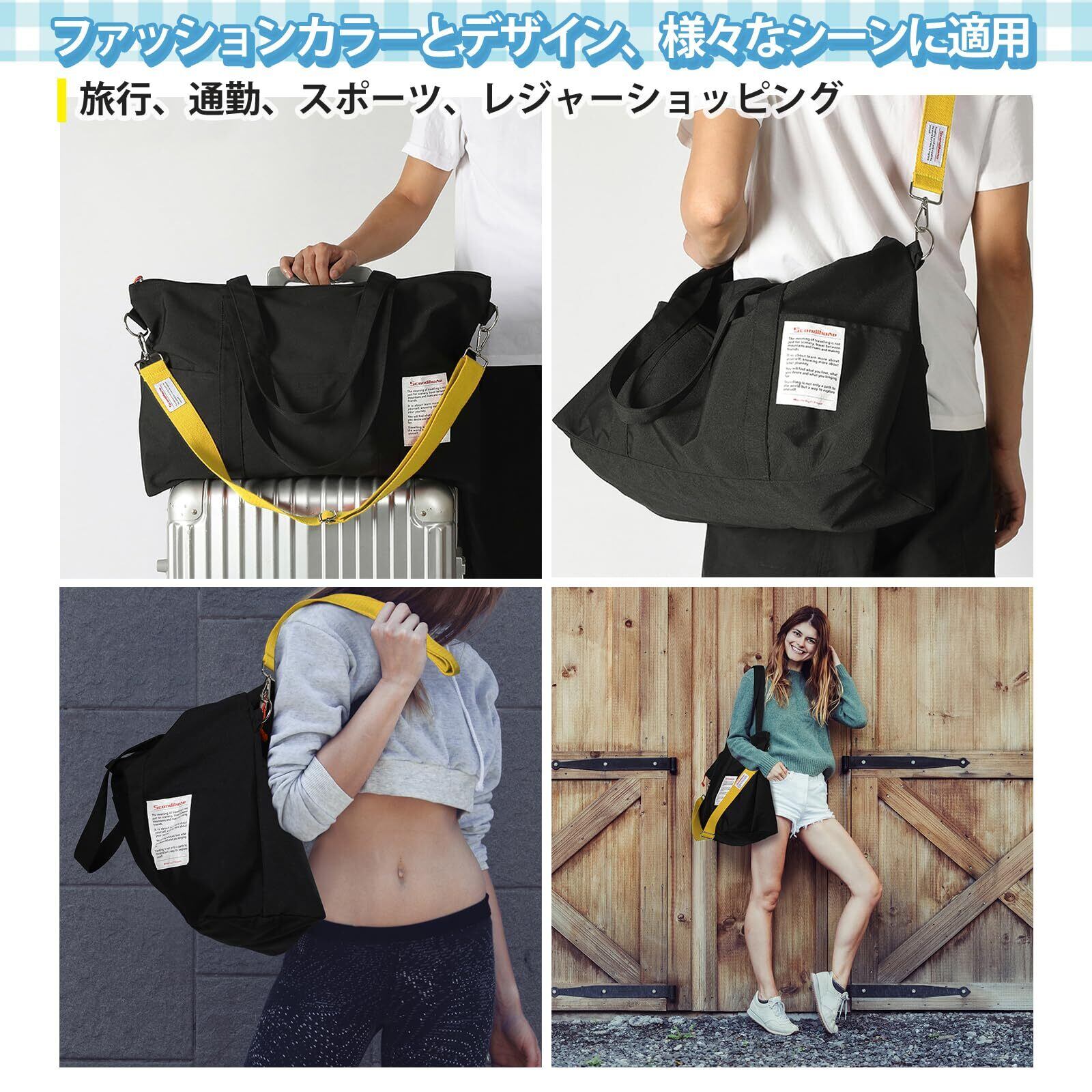 【3wayの使い方】おしゃれなキャリーバッグはスーツケースの上に置いて移動、バイカラーのショルダーストラップはショルダーバッグとして、トートバッグとしてもお使いいただけます。 ジム、ショッピングなど普段使いはもちろん、男女問わず幅広く使えるライトバッグです。