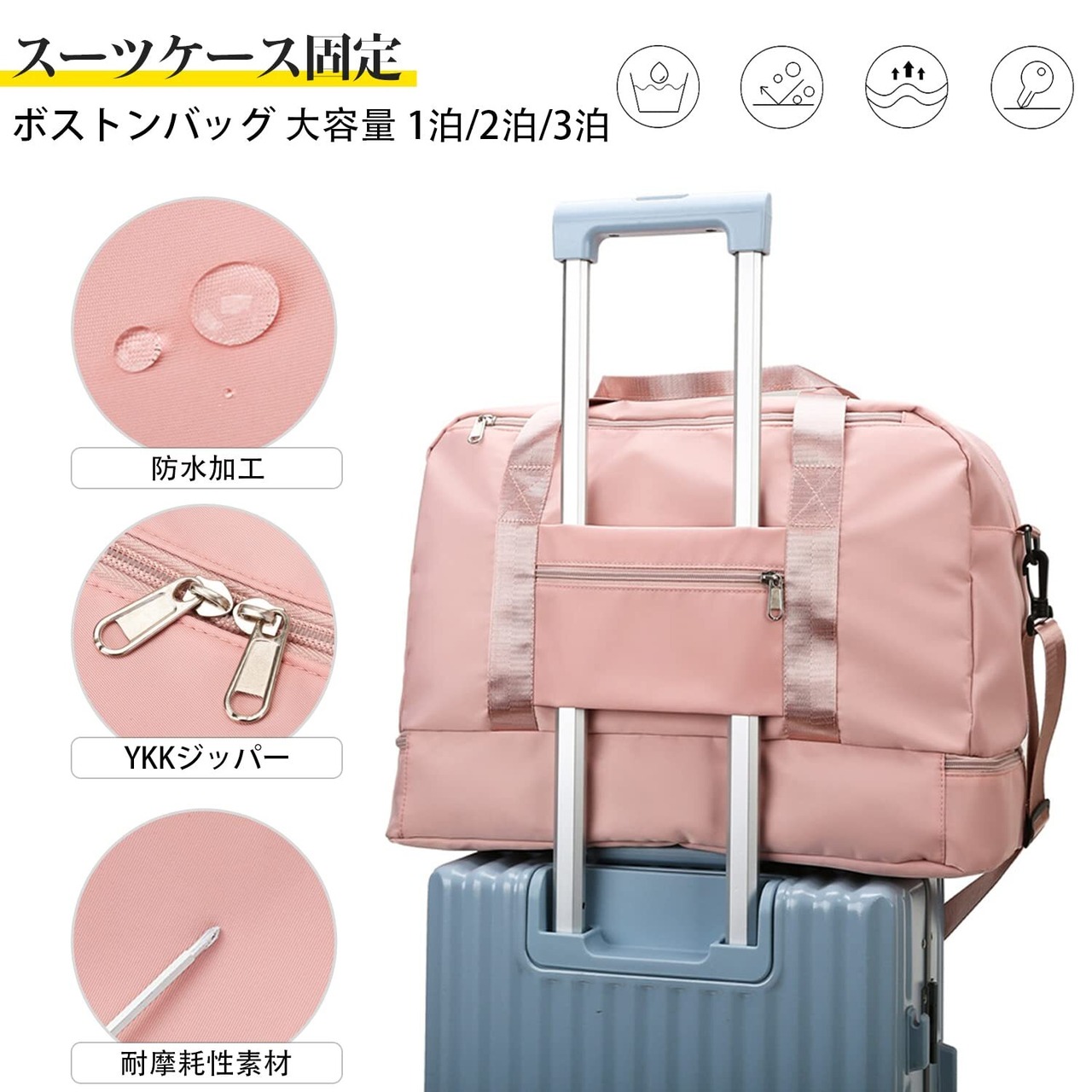 【高品質ジッパー / 防水加工 / 便利な収納】素材: オックスフォード布。防水性、耐久性にも優れています。水に強く、突然の雨などからお客様の貴重品をお守り致します。外側のポケットより出し入れ可能なシューズ専用収納ポケットもあり便利です。外部にもポケットがついており、まとまりにくい荷物でも簡単に整頓ができ、機能面も充実したボストンバッグです。