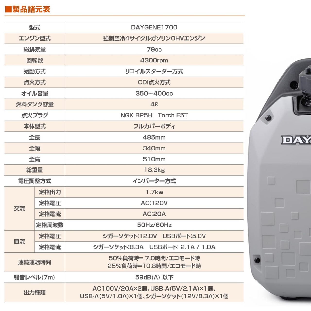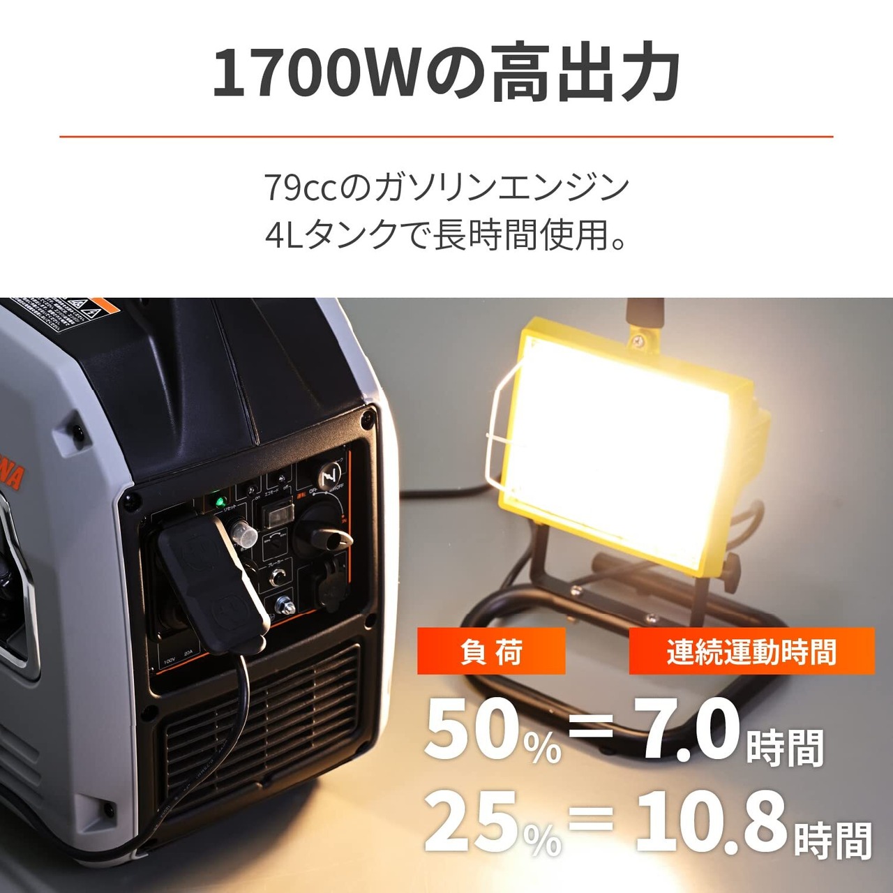 軽量でコンパクトなのに1700Wの高出力。発電機の内部のレイアウトの見直しによりコンパクト化が実現。また、インバーター発電機なのでパソコンやスマートフォンなどの精密機器でも安心してご使用いただけます。標準装備でAC100V(20A)2ポート、シガーソケット(8.3A)1ポート、USB(2.1A/1A)2ポート付き、さらに付属のUSBシガーソケットを使うことでUSB(2.4A)を2ポート追加することができます。補修部品も豊富に設定していますので、末長くご使用いただけます。【スペック】定格出力:1700W騒音レベル(7m):59dB(A)以下本体重量:18.3kg全長×全幅×全高:485×340×510(mm)エンジン型式:エンジン型式強制空冷4サイクルガソリンOHVエンジン総排気量:79cc燃料タンク容量:4L連続運転時間(エコモード時):50%負荷時= 7.0時間/25%負荷時=10.8時間付属品:オイルジョウゴ、ドライバー、レンチ、点火プラグソケット、USBシガーソケット(USB2ポート)