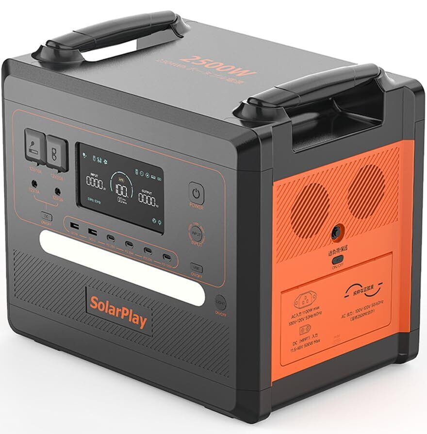 SOLARPLAY 2500Wポータブル電源 大容量 2300Wh/720000mAh リン酸鉄リチウム電池採用 1.5時間満充電 AC2500W 瞬間最大5000W/DC/USB/XT60出力 14台機器同時充電可能 50Hz/60Hz 純正弦波 MPPT制御方式 静音設計 家庭用蓄電池 車中泊 防災グッズ