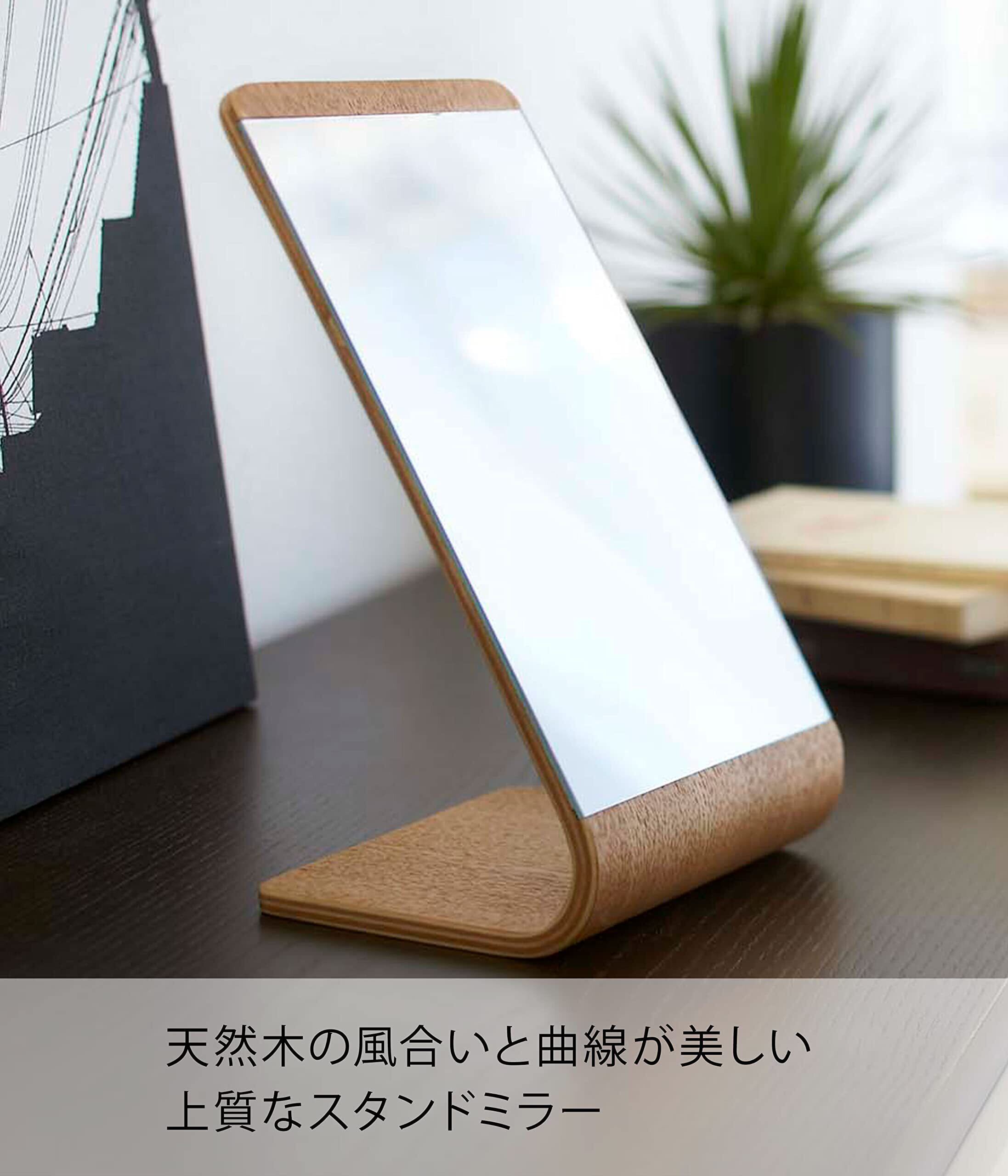 天然の木目を生かした温もりあるデザインのスタンドミラーです。丸くカーブしたフォルムはシンプルながらもスタイリッシュな印象に。机の上に置いたままでも生活感を感じさせず、インテリアとしてもお部屋の雰囲気を引き立ててくれます。