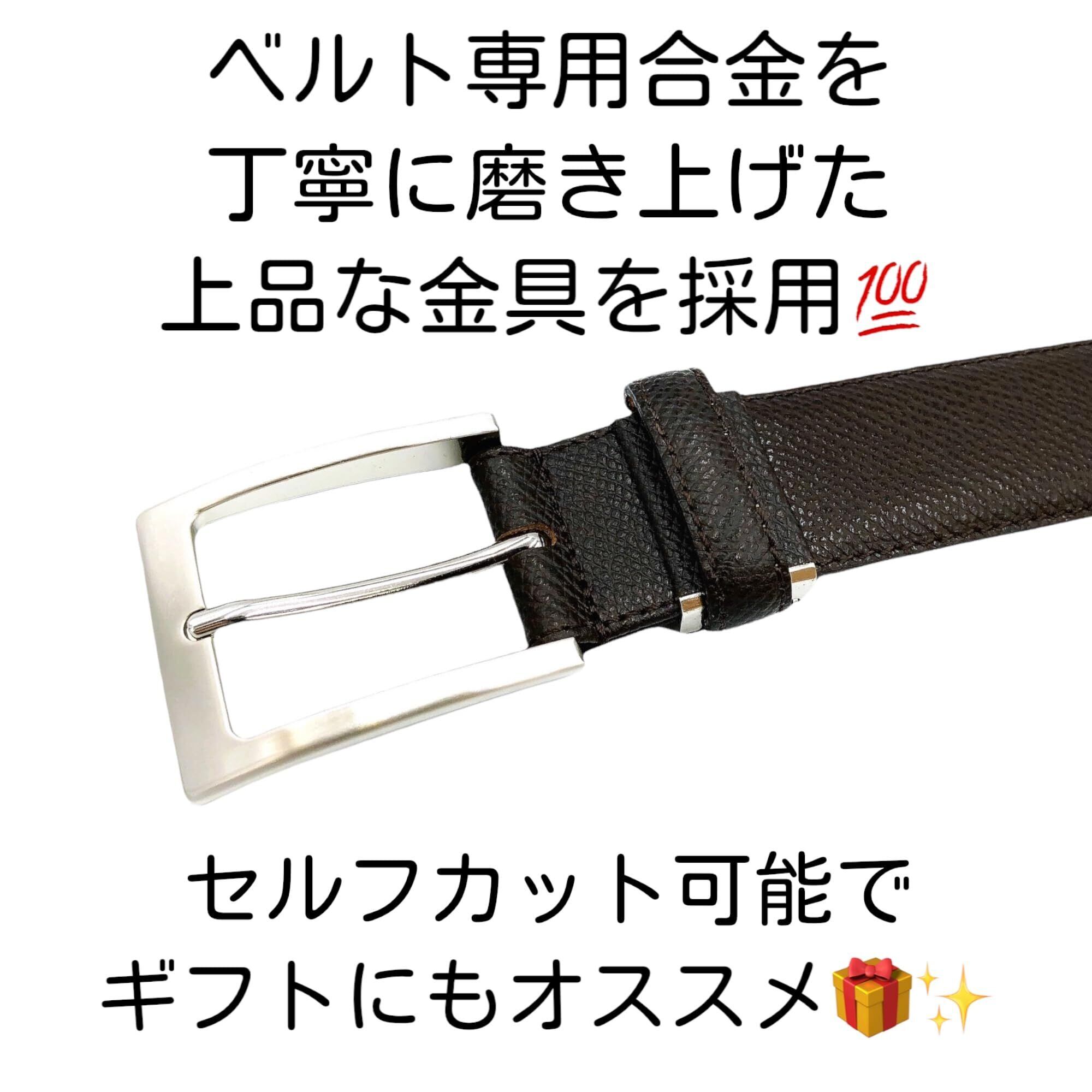 【世界基準のバックル】 高級ブランド品の金具を生産している、世界有数の美錠専門工場に依頼。耐久性を高めるために適した合金を調合し、綺麗に磨き上げらえたベルト向けに設計されたバックルを使用しています。