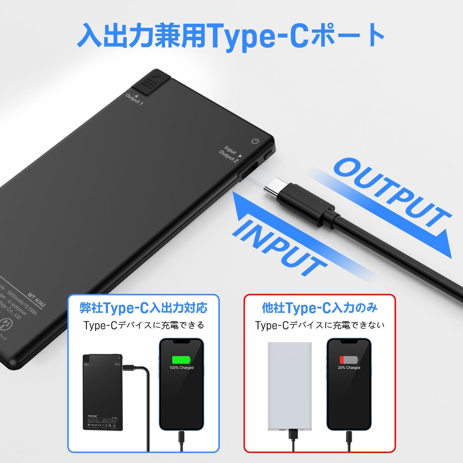 TYPE-Cポート入出力対応:5V/2.1A入出力に対応したUSB Type-Cポートを搭載しております。モバイルバッテリーへの充電、スマートフォンへの給電を行うことができます。付属のUSB Type-Cケーブルでモバイルバッテリーをフル充電まで約3.3時間かかります。