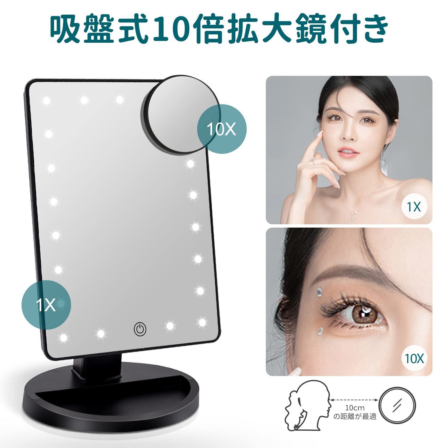 FASCINATE 21個LED 鏡 ライト付き 卓上 スタンドミラー 無段階調光 usb/乾電池給電 10倍拡大鏡 メイク用 明るい 角度180調整可能 人気 黒