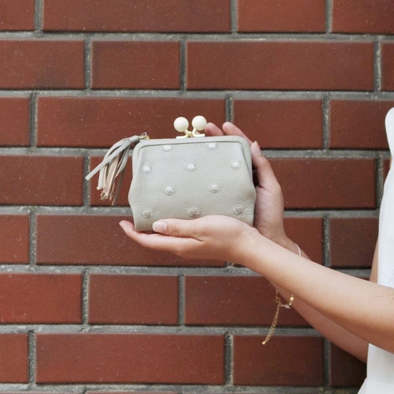 がま口部分のアクリル玉がかわいい2つ折り財布。