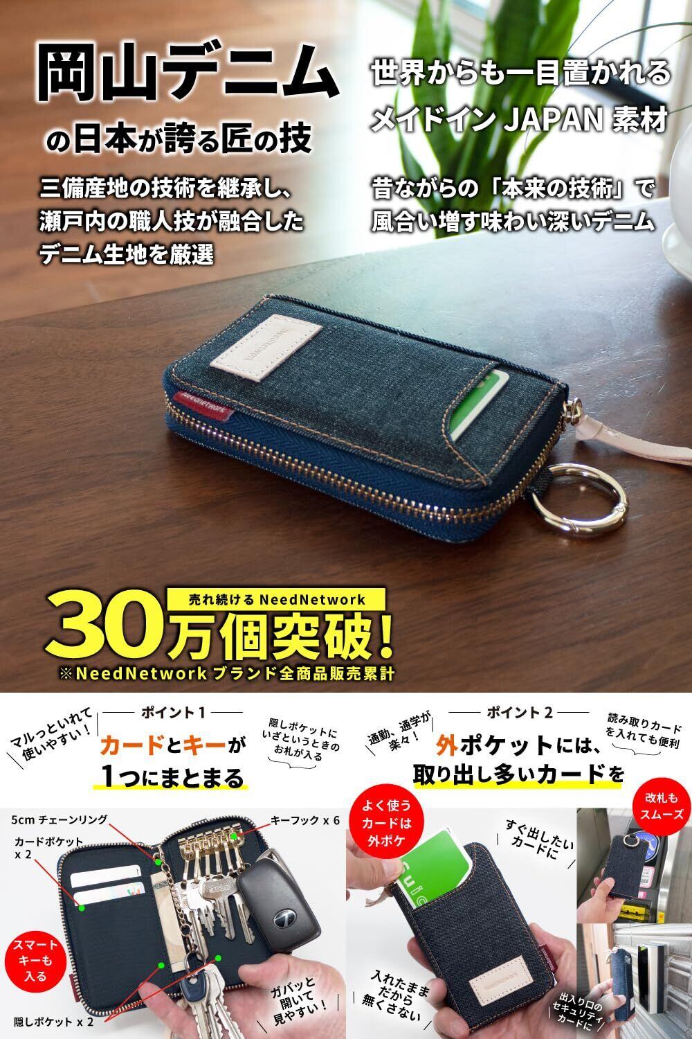 [ニードネットワーク] 岡山デニム キーケース メンズ スマートキーケース カード 大容量 メンズキーケース 6連 外側ポケット カード入れ キーリング