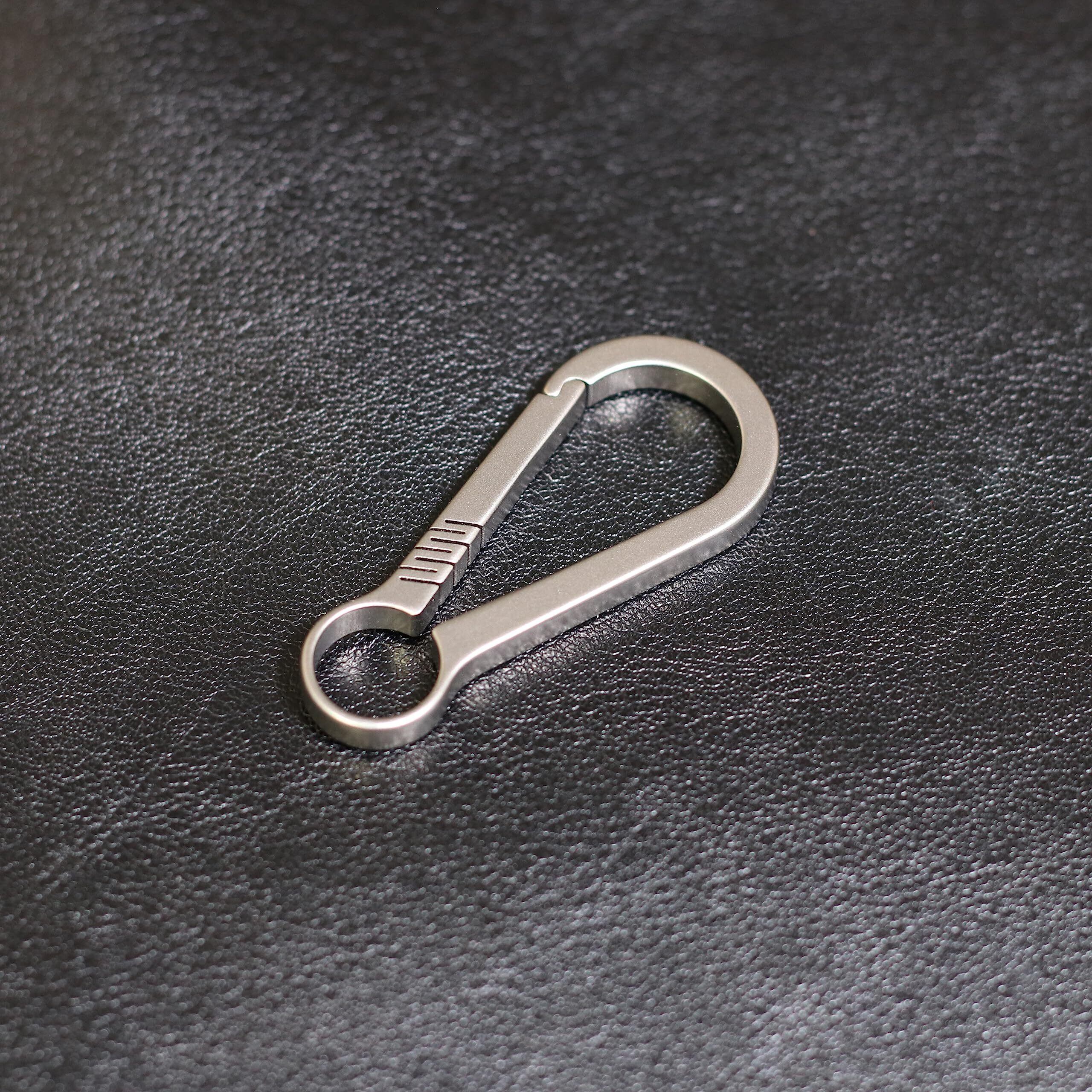 【バネのない一体成型仕上げの小型チタンカラビナ】強度と軽量性に優れたチタンのバネ性を活かし、つなぎ目のない一体成型で仕上げたカラビナ型キーホルダー。
