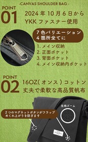 【素材】コットンキャンバス(綿・帆布) 裏地:ポリエステル 自然素材のコットンキャンバスは厚手の質感と手触りが心地良いショルダーバッグ。伝統的な配達カバンの原型を残し、ザックリと使い易いメッセンジャーバッグ風に仕上げています。斜め掛けバッグとしての使用をお薦めします