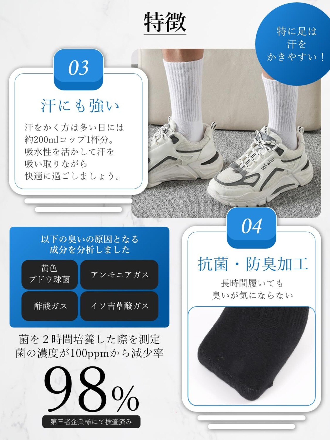 grannysmith ソックス は 抗菌 消臭 に優れております。 足は汗をかきやすく、汗を多くかく方の発汗量は両足で約200ml(コップ1杯)といわれ,この汗に菌が繁殖することで嫌な臭いが発生。 grannysmith ソックス は汗をかいた際に繁殖する菌を減らすことが検査にて実証されており、長時間靴を履かれる方でも靴を脱いだ時 の嫌な臭いを発生しにくくしました。 ※ ソックス それぞれに各種の菌を付けて2時間放置した後、 ソックス を計測 したところ 菌の繁殖率が98%軽減(国内正規機関調べ) 素材には 綿 をメイン素材として使用しており、 通気性 は勿論、 伸縮性 、 吸汗性 、 吸水性 にも優れています。 またかかとから履き口までを20cmの長さで設定。 椅子に座った時 足を組んだ時 などに 肌が露出しにくい長さ になっております。 ソックスの 程良いフィット感 を楽しみながら ビジネスシーン は勿論、 通学 や 冠婚葬祭 スポーツ で活躍いたします。 春夏秋冬を問わず全ての季節においてご使用ただけます。様々な場面でご使用ください。