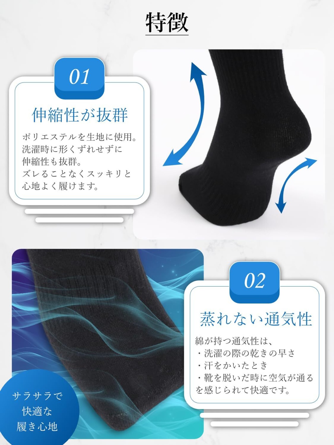 【通気性抜群】 綿 をメイン素材とし独自の織込技術により形成。通気性 は勿論、伸縮性 、吸汗性 、吸水性 にも大変優れています。足の汗を生地が吸い取ってくれる効果により快適な一日を過ごすことが出来ます。