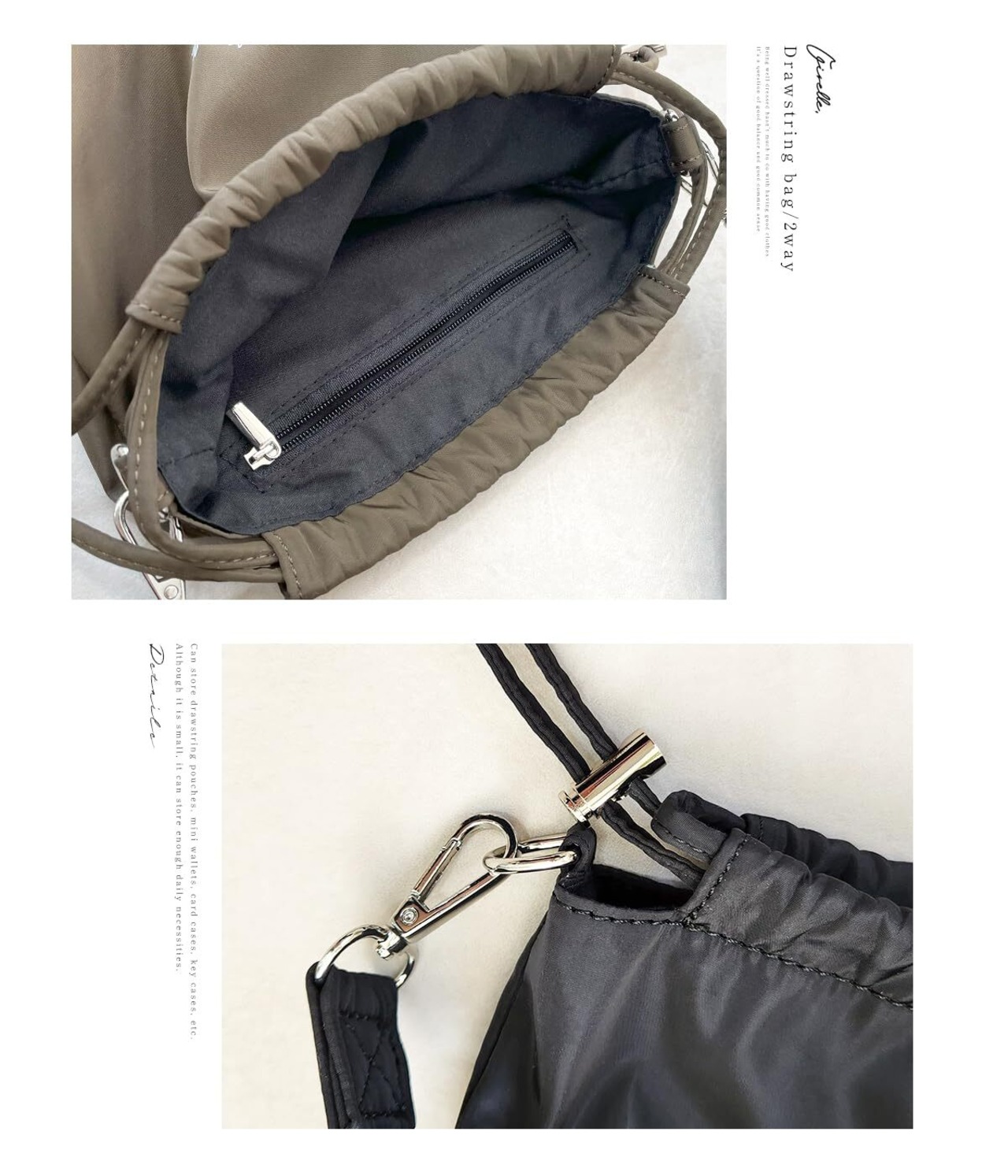シンプルデザインのコンパクトな2way巾着バッグ。 巾着をキュッと絞ればコロンと可愛いフォルムに。 ポーチ、ミニ財布、カードケース、キーケースなど収納可能。 小さくても毎日の必需品はスッキリ収まります。