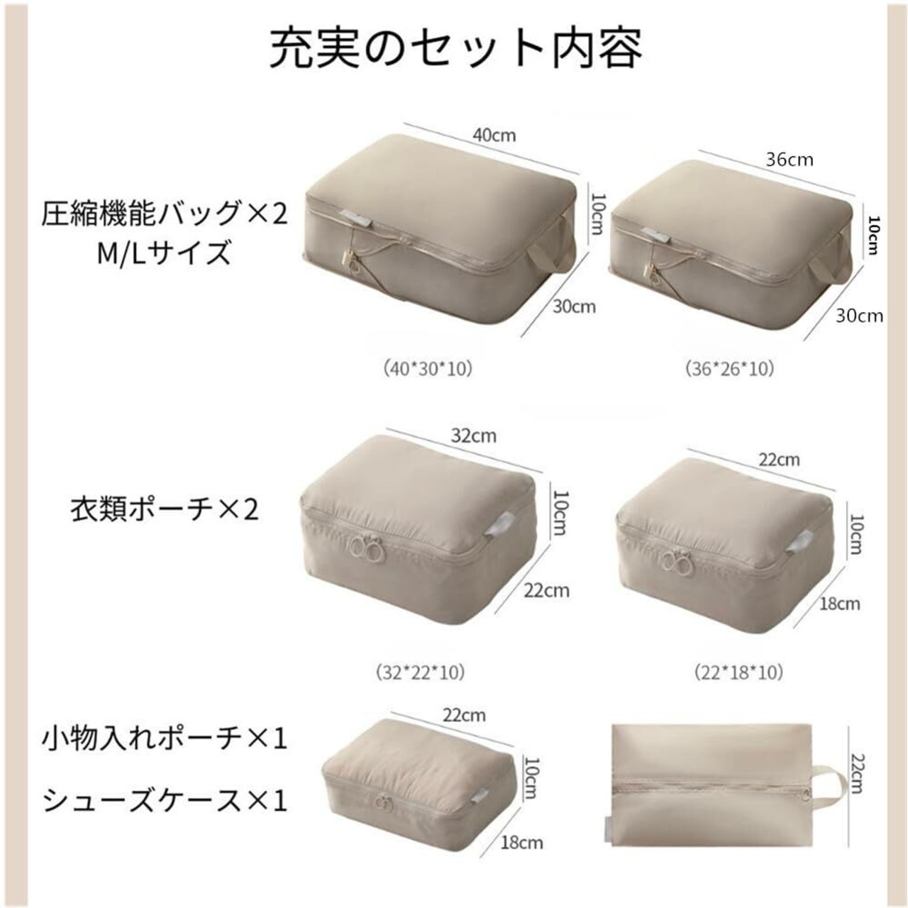 【セット内容】衣類圧縮収納ポーチ×2(M/L)、非圧縮汚れた服収納袋×1、下着用ポーチ×1、靴下の収納袋×1、シューズバッグ×1、掛け式化粧ポーチ×1、汚れた衣類用のランドリーバッグ×2。