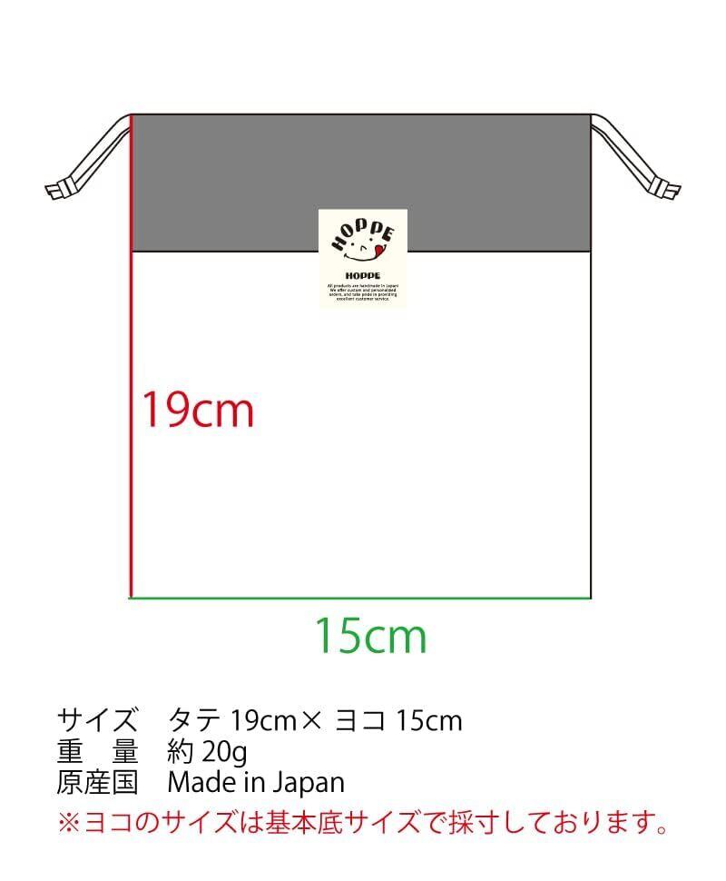 お子様のマスクやランチョンマットに入れぴったりの巾着サイズ。内側にお名前を記入出来るネームタグ付き。サイズはサイズはタテ19cm×ヨコ15cm(開口部15cm) 重さ20gです。