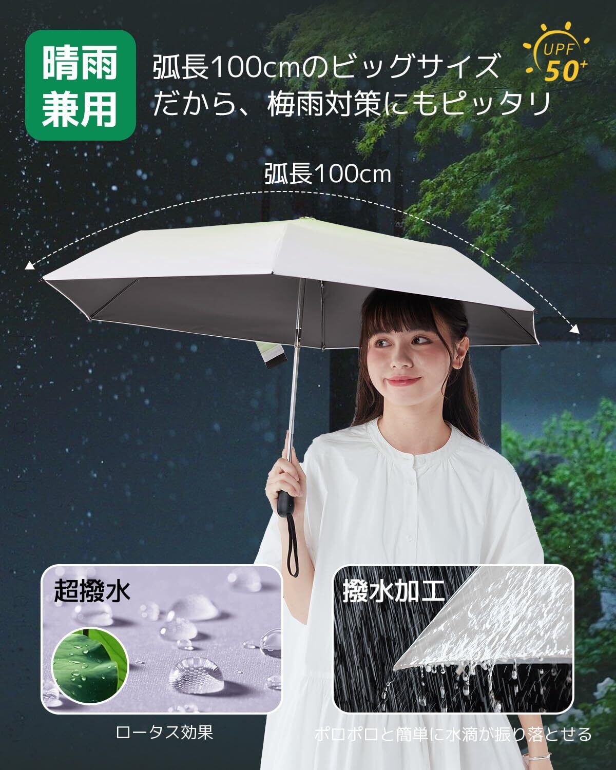 【UVカット・日焼け止め】日傘布の裏側はナノ抗紫外線ノリコーティングと断熱黒ノリコーティングを採用して、可視光と紫外線を遮断して、効果的に日焼け止めすることができます。暑い夏に、紫外線からしっかり肌を守れます。UPF50+、UVカット率99.9%以上、100%完全遮光で熱線となる太陽光線がカットされ、紫外線をブロックして、お肌を守り、熱い日差しの中でも涼しく過ごせます。