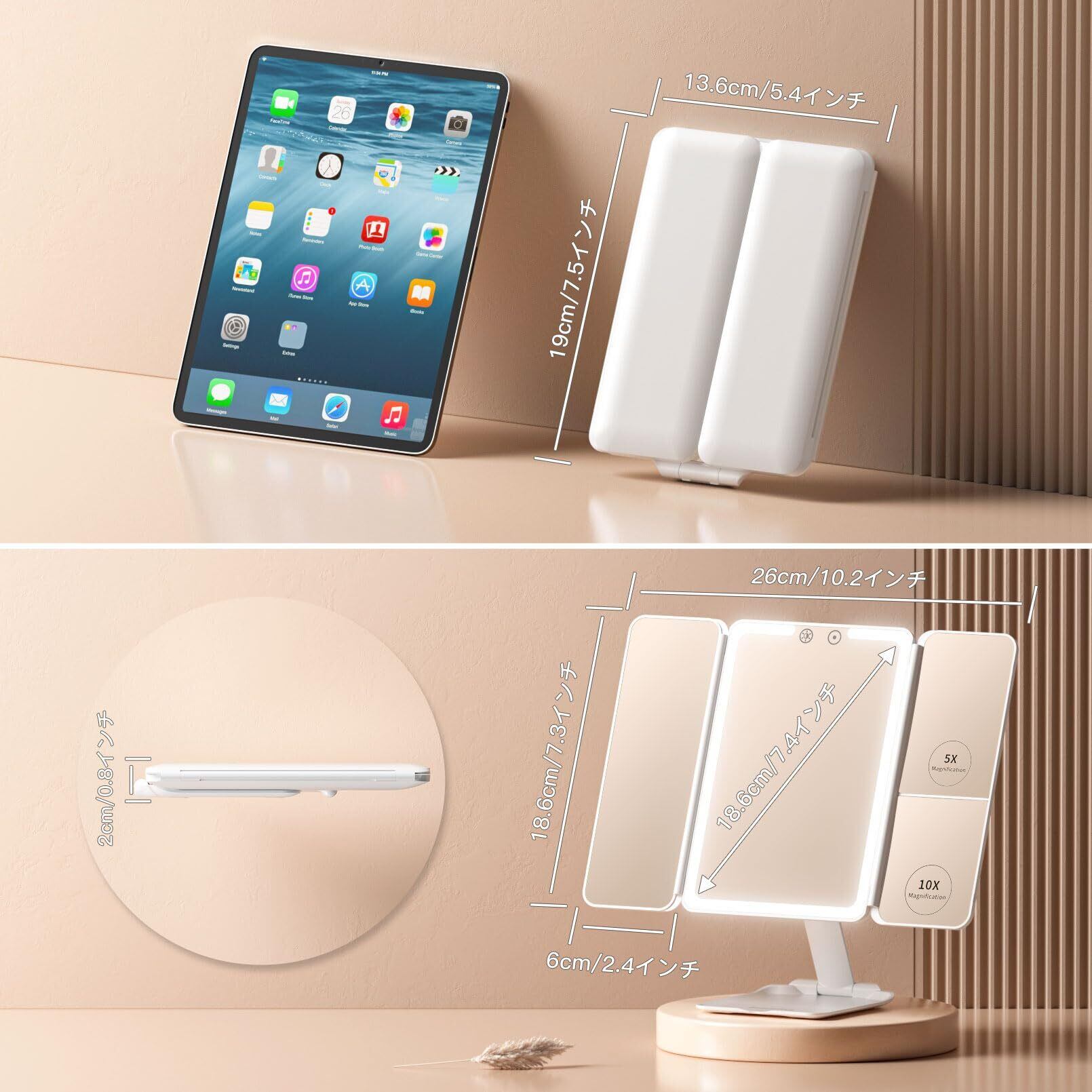 Beautifive 化粧鏡 三面鏡 卓上 ミラー led ミラー 女優ミラー 1X/5X/10X 拡大鏡 ライト付き 拡大鏡 メイク ライト付きミラー 軽量 タッチ式 明るさ調 メモリー機能 3カラーライト ポータブル USB充電可能
