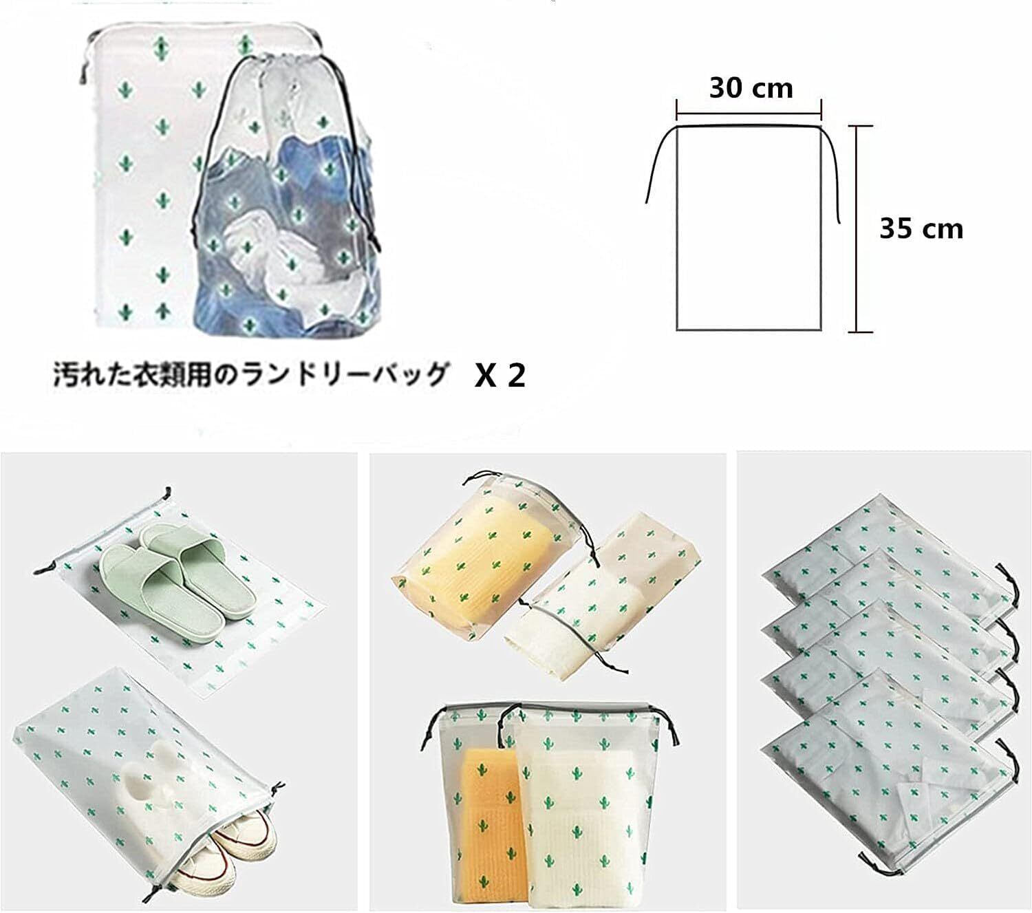 【セット内容】衣類圧縮収納ポーチ×2(M/L)、非圧縮汚れた服収納袋×1、下着用ポーチ×1、靴下の収納袋×1、シューズバッグ×1、掛け式化粧ポーチ×1、汚れた衣類用のランドリーバッグ×2。