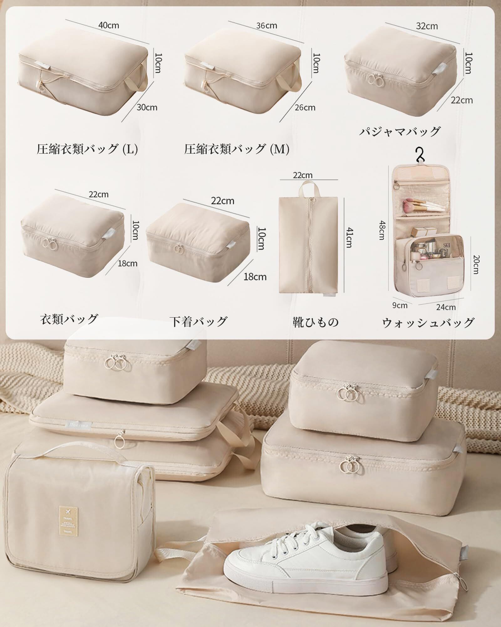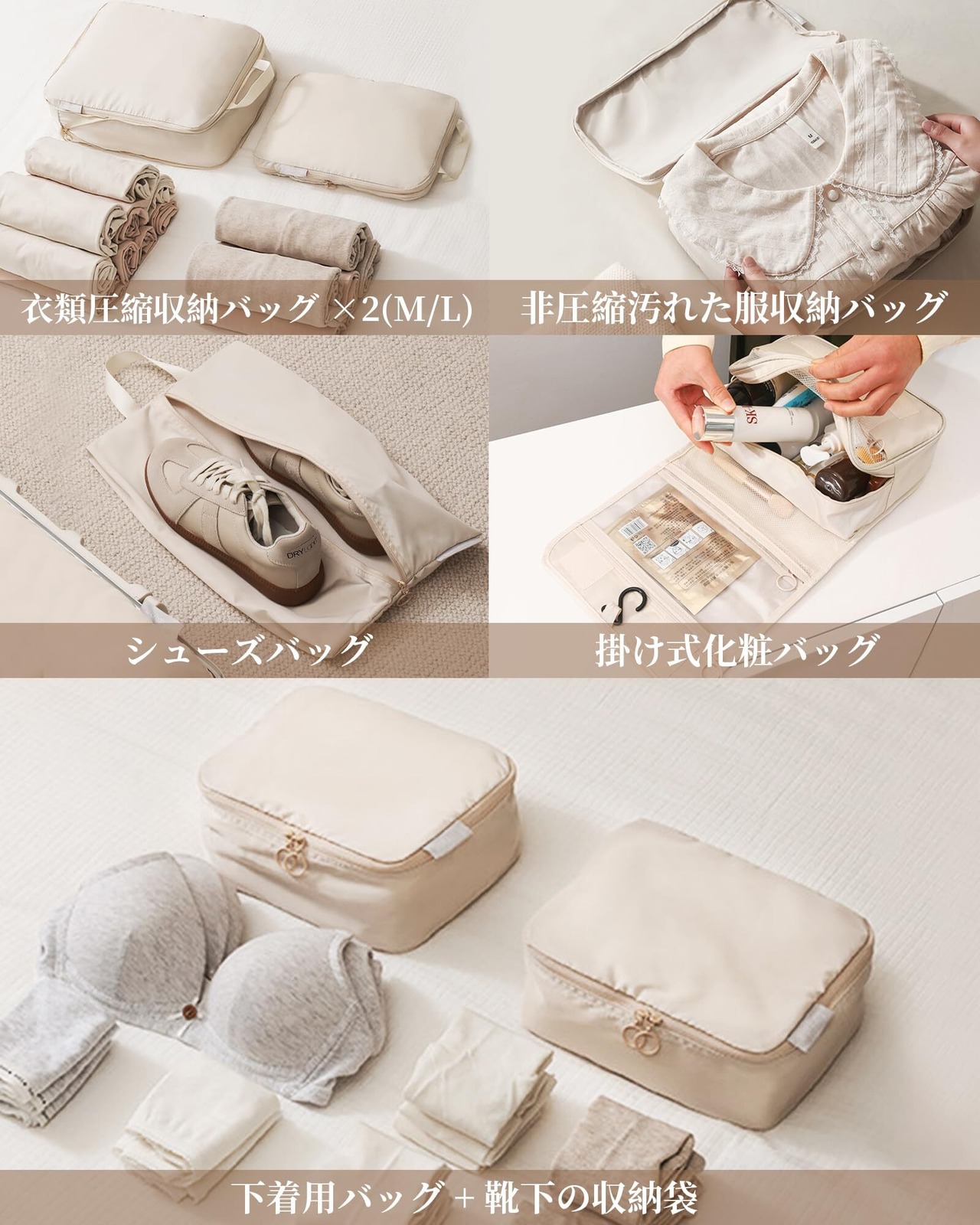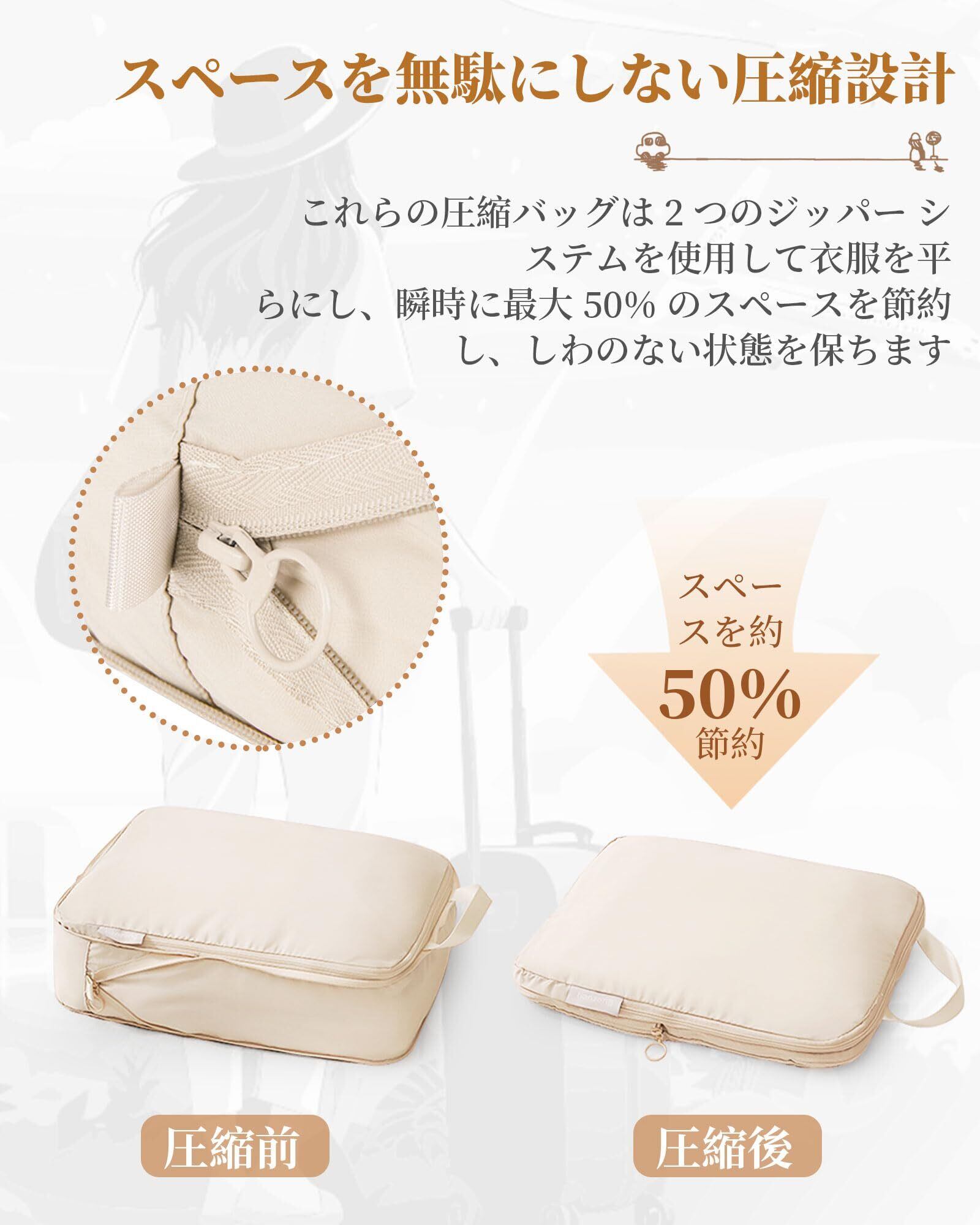 【2022最新】トラベルポーチ 圧縮 7点セット 旅行用ポーチ パッキングポーチ スペース40%節約 圧縮袋 旅行 圧縮バッグ スーツケース仕分け 軽量 丈夫なファスナー圧縮 出張 旅行 便利グッズ ベージュ | asaRulu0511