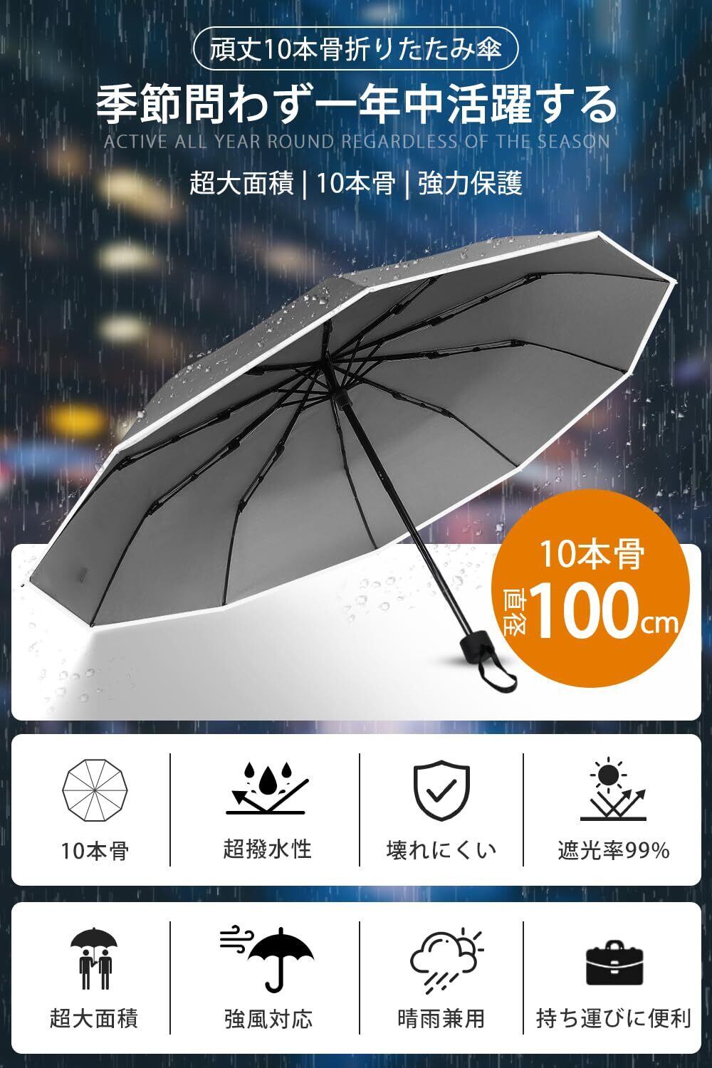 【大きいサイズ&頑丈の折りたたみ傘 軽量 メンズ】折り畳み傘の表面のアークの長さが114cmに達し、傘の直径が100cmに達しております。普通の折り畳み傘 メンズの直径が90cmしかありません。大雨·強風の日も安心の大きめサイズ!大人二人がすっぽり入ります。しかもシンプルなデザインを採用し、ビジネスカジュアルにも便利に合わせることができます。更に落ち着いた色もメンズに適します。また、頑丈な10本骨 折りたたみ傘です。 柔軟性と強度を併せ、耐風性と耐久性ともに向上させた折りたたみ傘です。 空気力学に基づいて風を受け流す構造で設計されているので、強い風でびっくり返っても元に戻ります。 また、コーティングを噴霧しているので錆びることは心配がありません。
