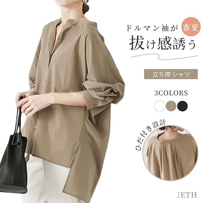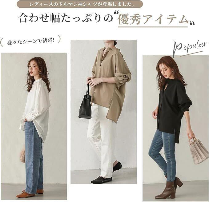 サイドの切り替えと小さなスタンドカラーが可愛らしく個性的なシャツです。後ろはプレスプリーツの襟で、自然に落ちて風に浮くようになっています。 また、前が短く後ろが長いので、360度から見たときのレイヤードスタイルがとても洗練されたシャツに仕上がっています。ナチュラルな雰囲気とリラックスな着用感で毎日穿きたくなります。このレディースシャツのもう一つの目玉は、ドルマン袖のデザインです。 今年はフレンチスタイルのシャツが大人気なので、ドルマン袖がシャツに取り入れられるのは当然です。 白シャツよりも個性が強く、センスが光るので、腕の肉付きがいい女の子にはぴったりで、気後れすることもありません。 カジュアルで抜け感のあるルーズフィットで、適度な軽さと着心地を実現した、春らしさいっぱいのシャツです。