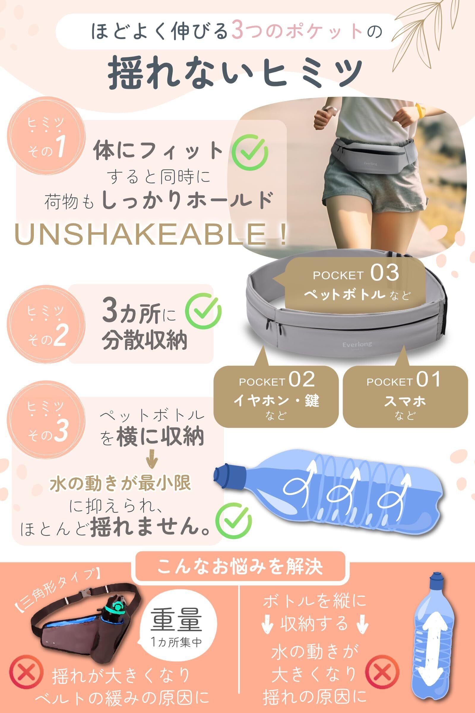 【3ポケット】ランニング時の必要最小限の荷物も、3つの独立したよく伸びるポケットに分散収納できます。メインポケットにはスマートフォンもケースを付けたままで収納できます。サブポケットはワイヤレスイヤホンのケースや鍵、コイン、リップクリーム等も入ります。ボトルポケットにはペットボトルが最大約550mlまで横向きに収納でき、別売りのカーブボトルを使用すればより体にフィットして快適なランニングが楽しめます。