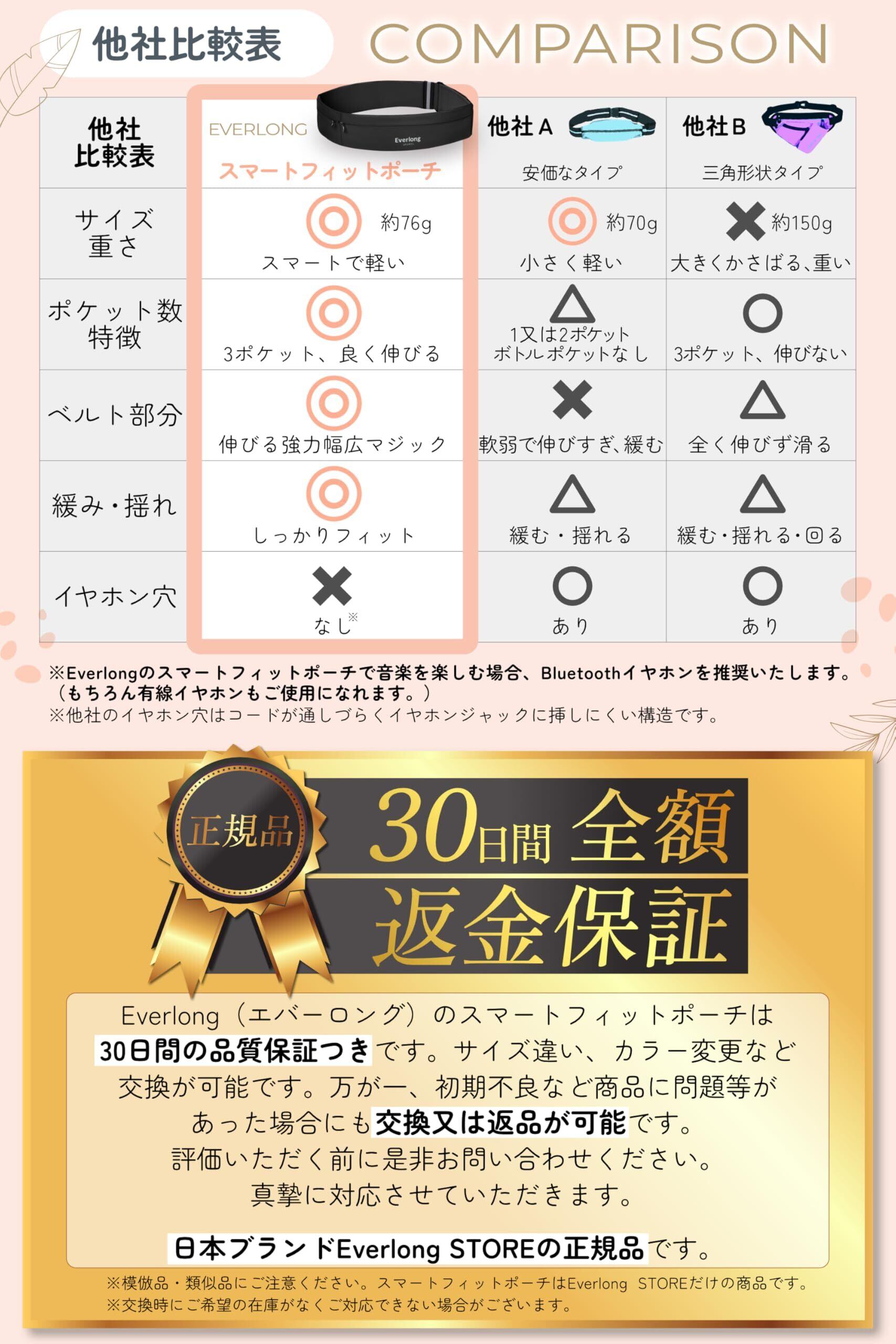 【スタイル】Everlongのスマートフィットポーチはシンプルで見た目もスッキリ。落ち着いたカラーバリエーションを揃えており、ランニングウェアにも合わせやすく、ファッションアイテムを身に着けるようにランニングスタイルをコーディネートしていただけます。スマート設計の為、Tシャツやウインドブレーカーなどのウェアの下に装着すればほとんど目立つことがなく、見た目は装着していないように感じられるでしょう。ポーチに見えないくらいスマートでスタイリッシュでありながら走りの邪魔にもなりません。Everlongのスマートフィットポーチが貴女のランニングライフをもっと素敵に演出いたします。