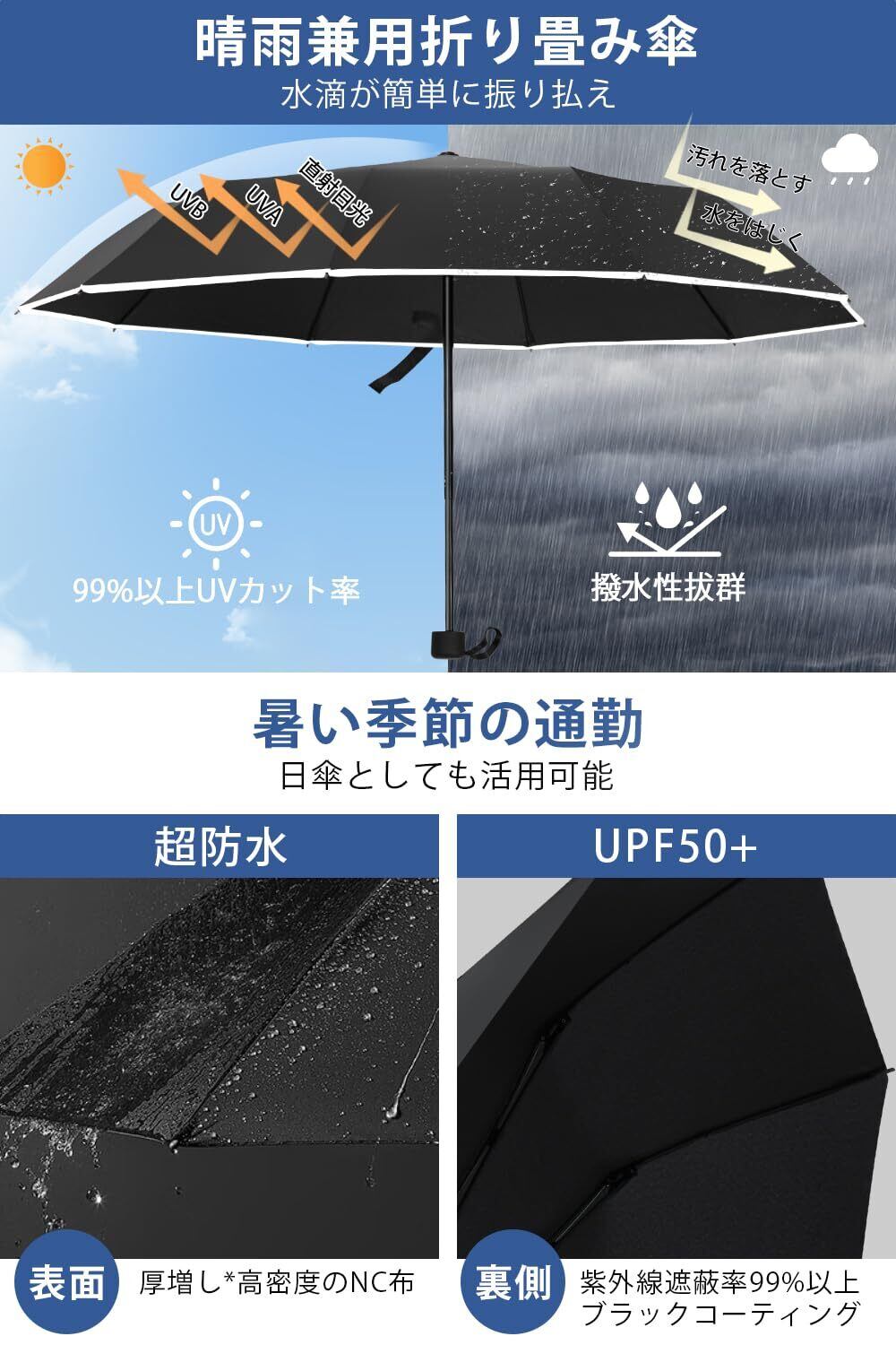 【大きいサイズ&頑丈の折りたたみ傘 軽量 メンズ】折り畳み傘の表面のアークの長さが114cmに達し、傘の直径が100cmに達しております。普通の折り畳み傘 メンズの直径が90cmしかありません。大雨·強風の日も安心の大きめサイズ!大人二人がすっぽり入ります。しかもシンプルなデザインを採用し、ビジネスカジュアルにも便利に合わせることができます。更に落ち着いた色もメンズに適します。また、頑丈な10本骨 折りたたみ傘です。 柔軟性と強度を併せ、耐風性と耐久性ともに向上させた折りたたみ傘です。 空気力学に基づいて風を受け流す構造で設計されているので、強い風でびっくり返っても元に戻ります。 また、コーティングを噴霧しているので錆びることは心配がありません。