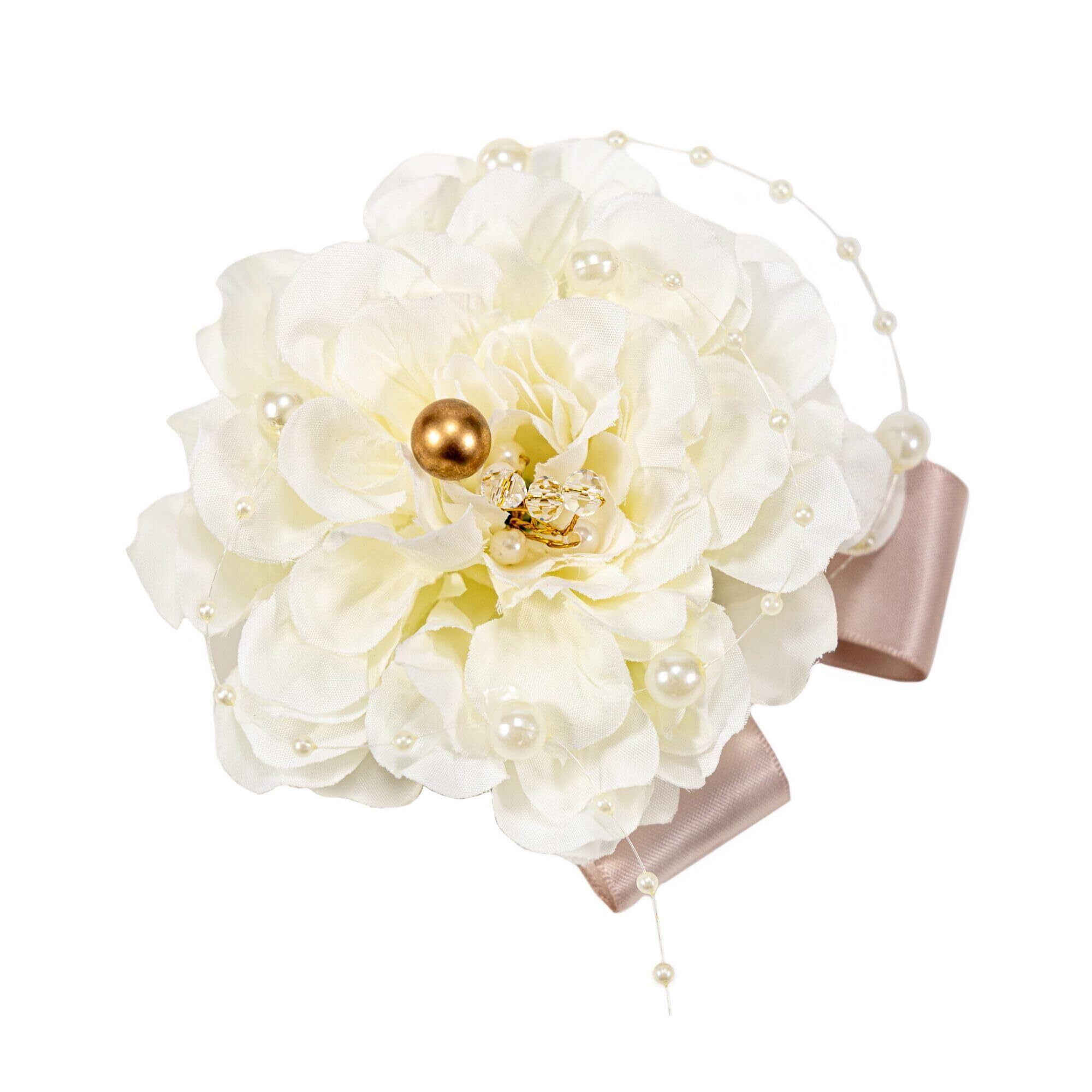 デザイン: 純白のエレガントな花びらにパールとビーズをあしらった上品なフラワーコサージュ
